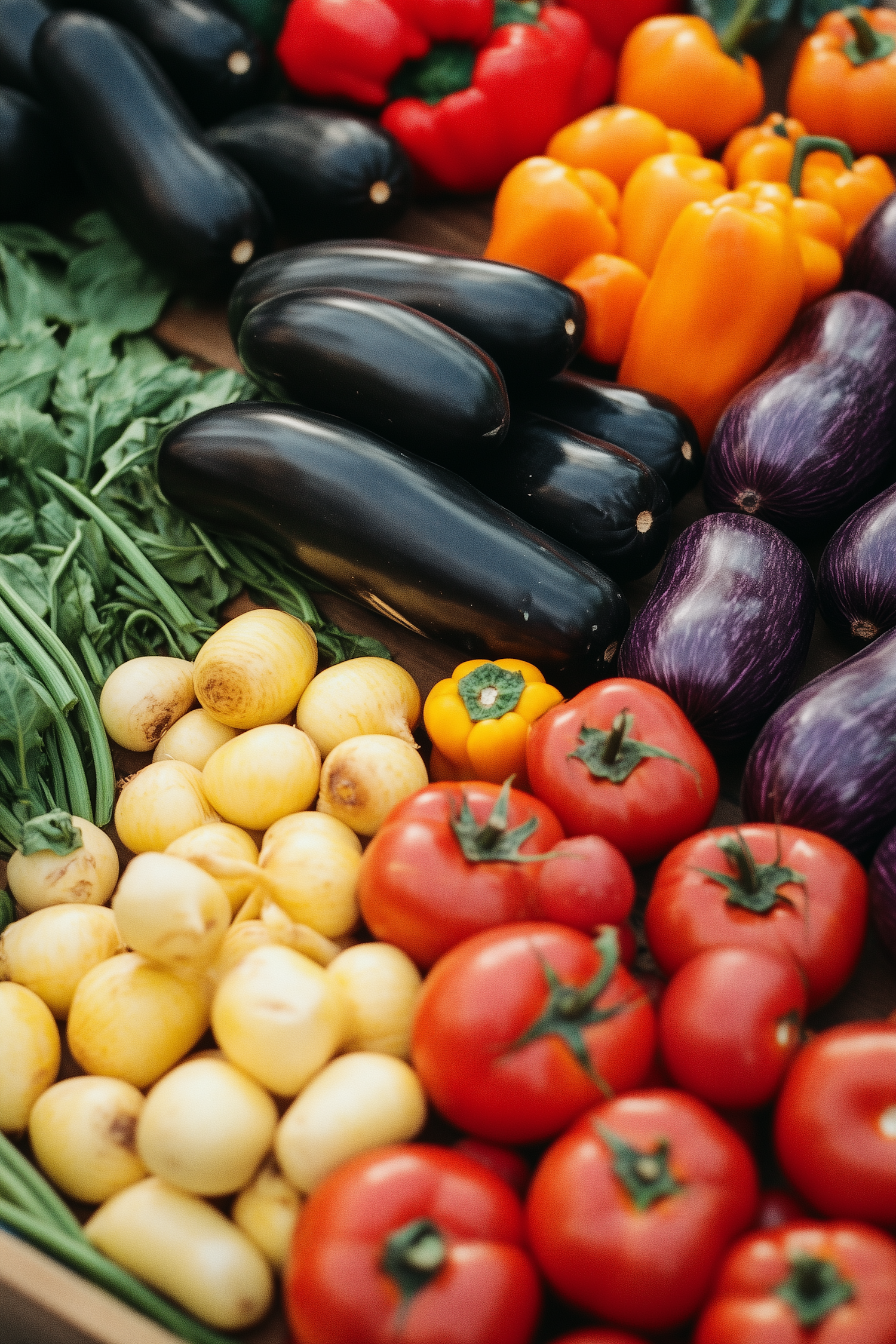 A colorful display of fresh vegetables including eggplants, tomatoes, bell peppers, potatoes, and leafy greens at a market.