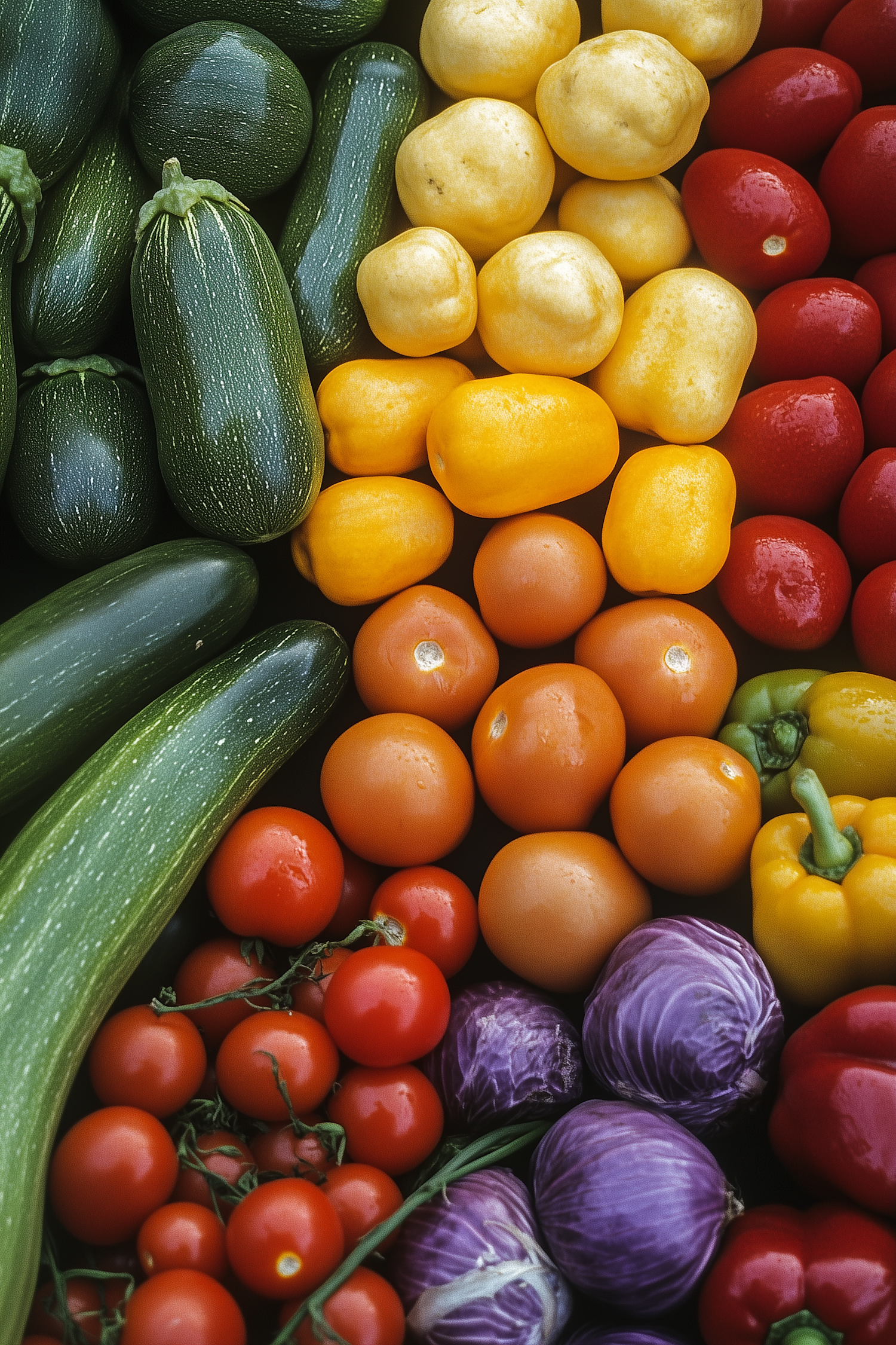 A colorful assortment of fresh vegetables, including zucchinis, tomatoes, potatoes, bell peppers, and cabbages, arranged in a gradient pattern.