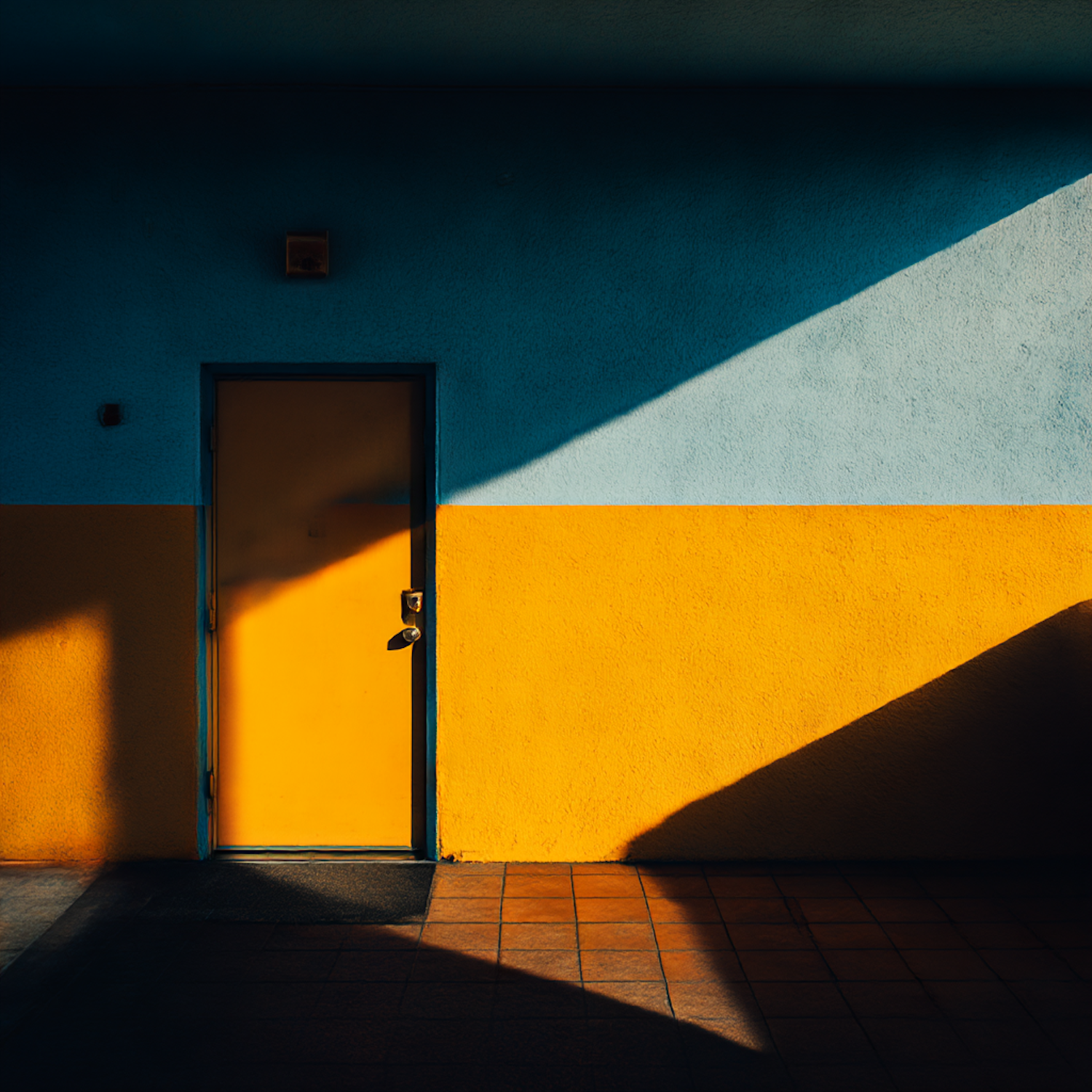 A vibrant yellow door set in a two-tone blue and yellow wall, with dramatic shadows and warm terracotta tiles below.