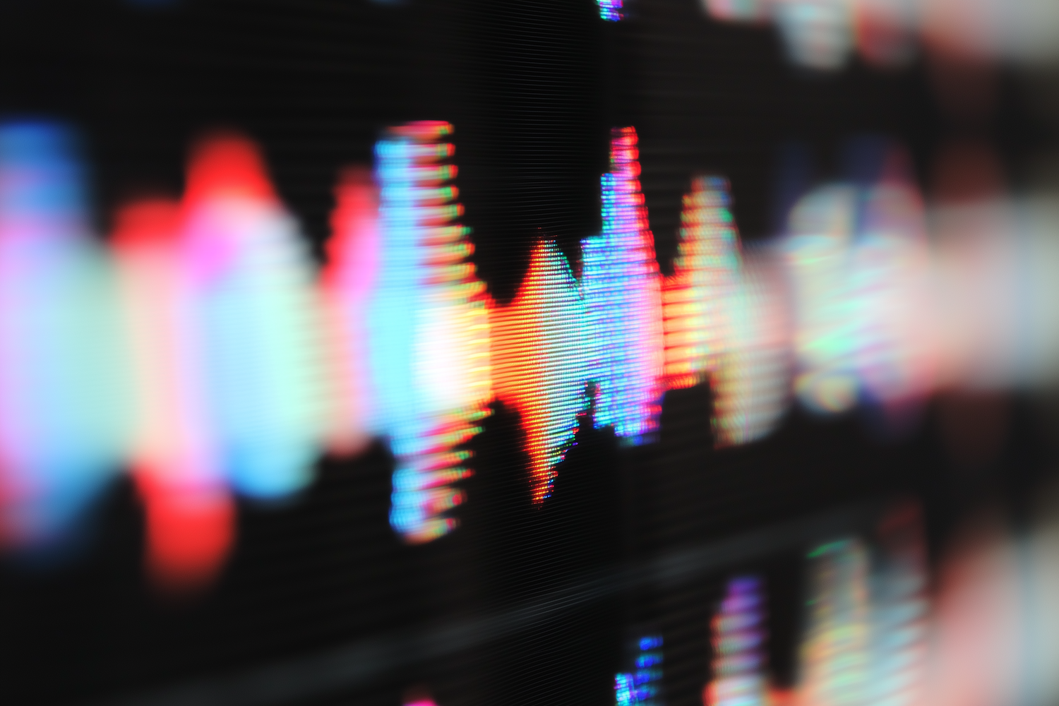 Vibrant, glowing audio waveform in red, blue, and orange hues on a dark background, evoking sound and rhythm in a modern, abstract style.