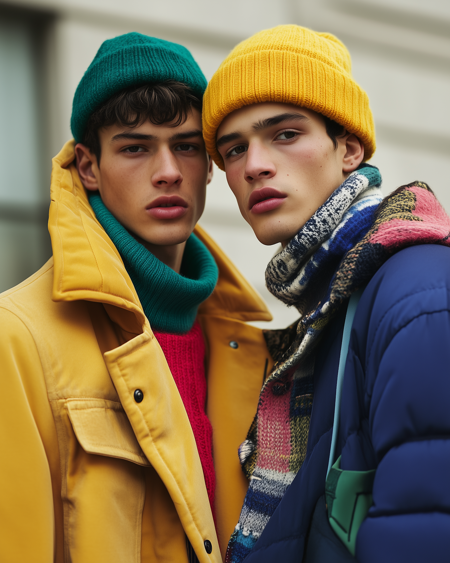 Two young men in colorful winter outfits, wearing beanies and jackets, pose closely together with neutral expressions.