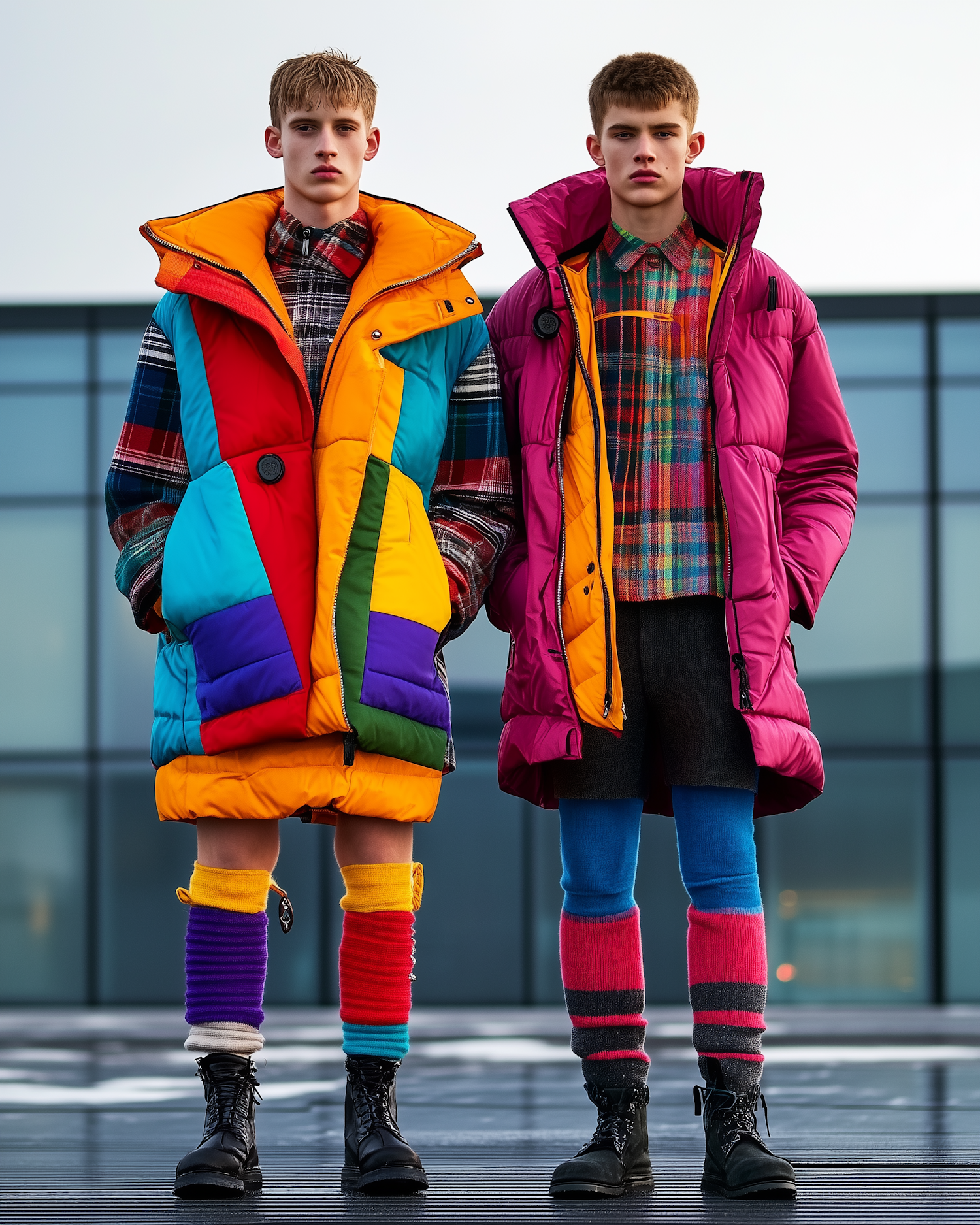 Two young men in vibrant, colorful winter outfits with multicolored puffer jackets and knee-high socks, standing on a rooftop.