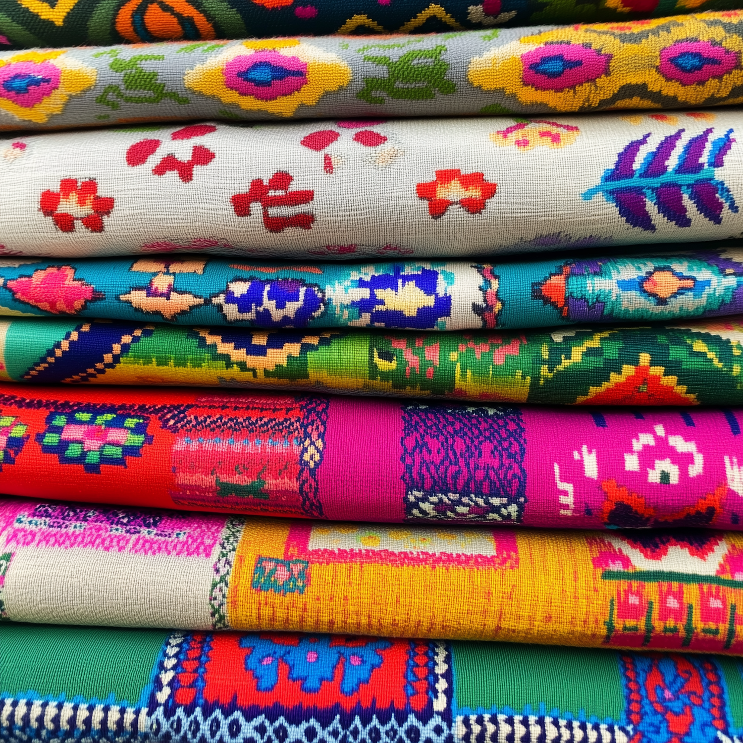 Stack of colorful woven fabrics with intricate floral and geometric patterns in vibrant hues like pink, yellow, green, and blue.