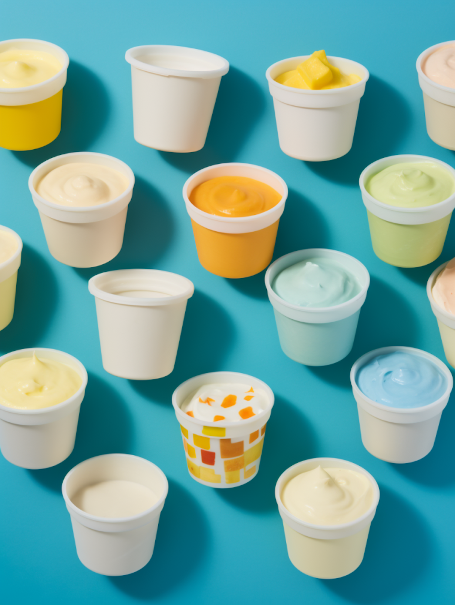 Colorful cups of creamy desserts on a blue background, featuring pastel shades and a unique mosaic-patterned cup.