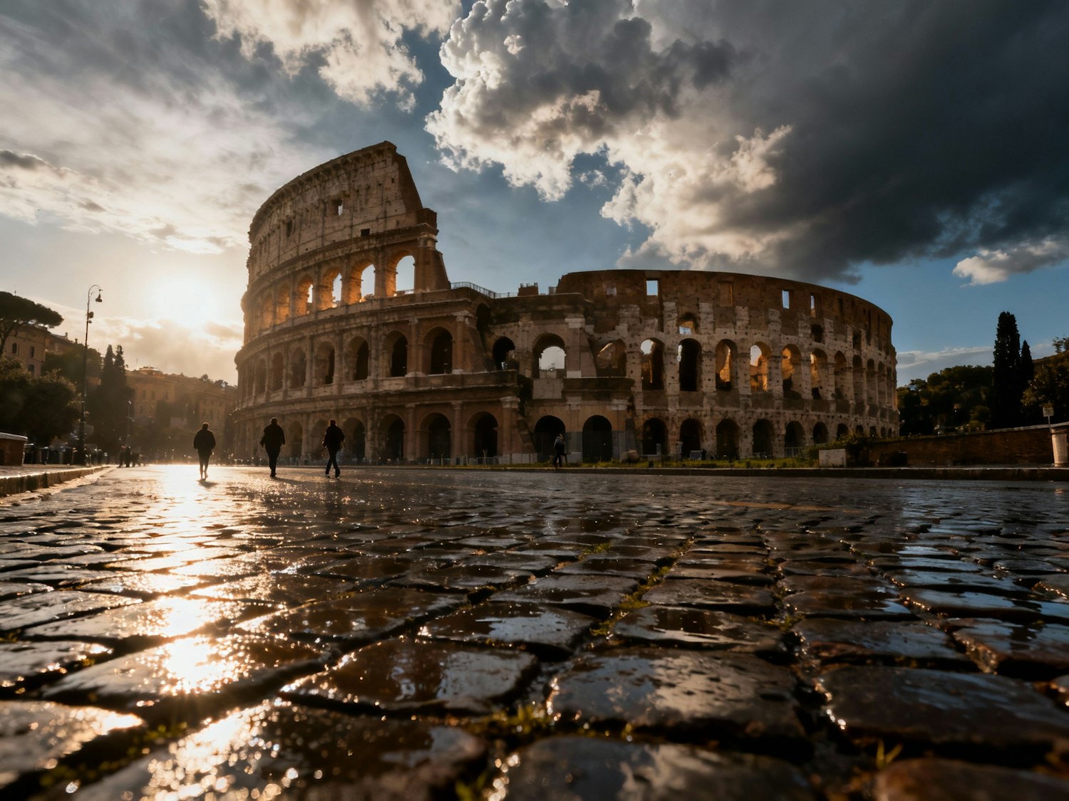 A stunning view of the Colosseum in Rome at sunset, with dramatic clouds, warm light, and reflections on wet cobblestones.