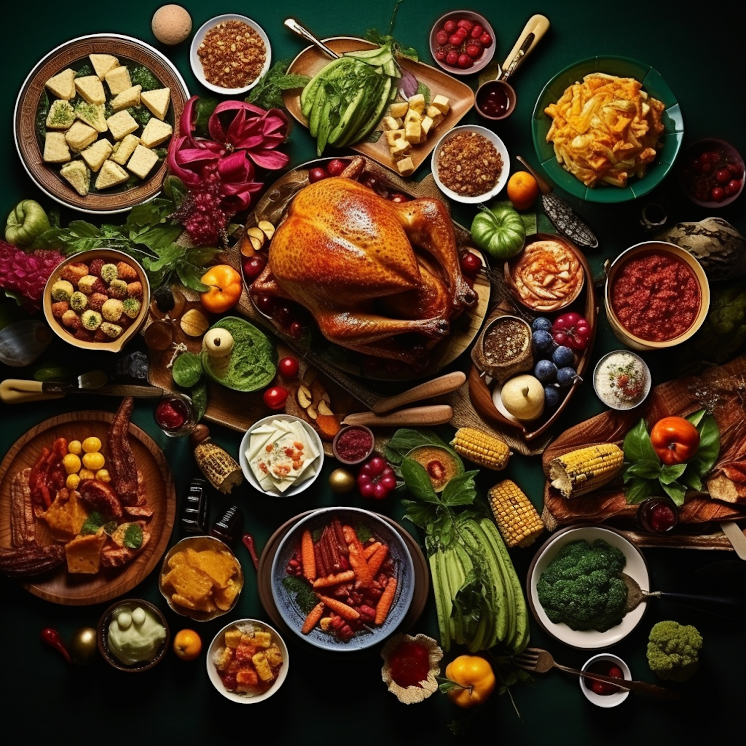 A vibrant Thanksgiving feast with a golden turkey, colorful vegetables, and an array of delicious side dishes on a green tablecloth.