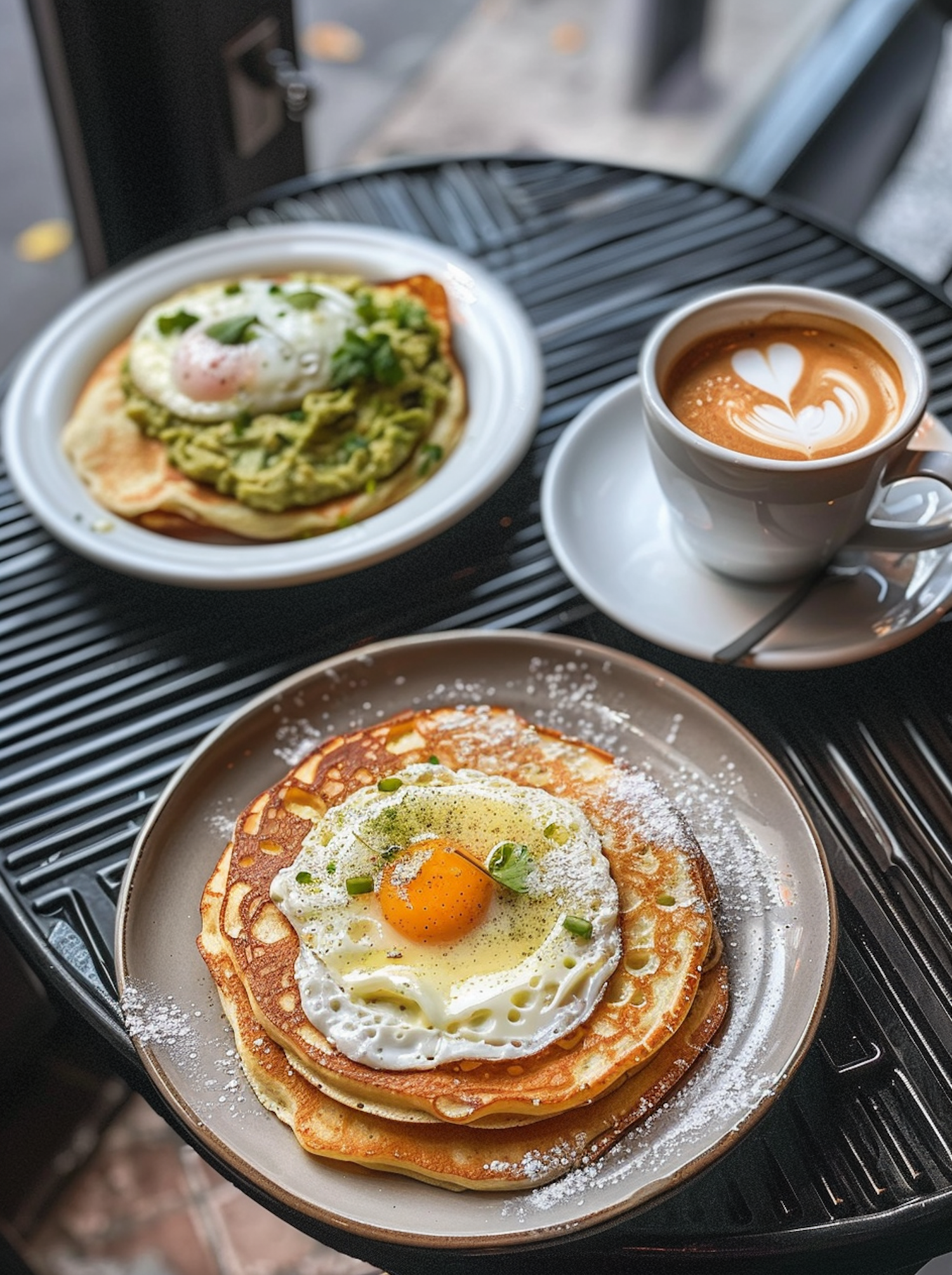 Delicious breakfast with pancakes, eggs, avocado, and coffee on a cozy table setting.