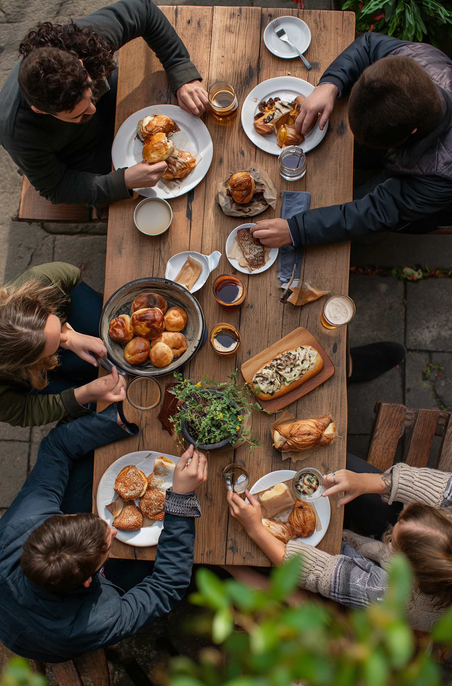 A diverse group enjoys a meal with baked goods at a rustic outdoor table, creating a warm and communal atmosphere.