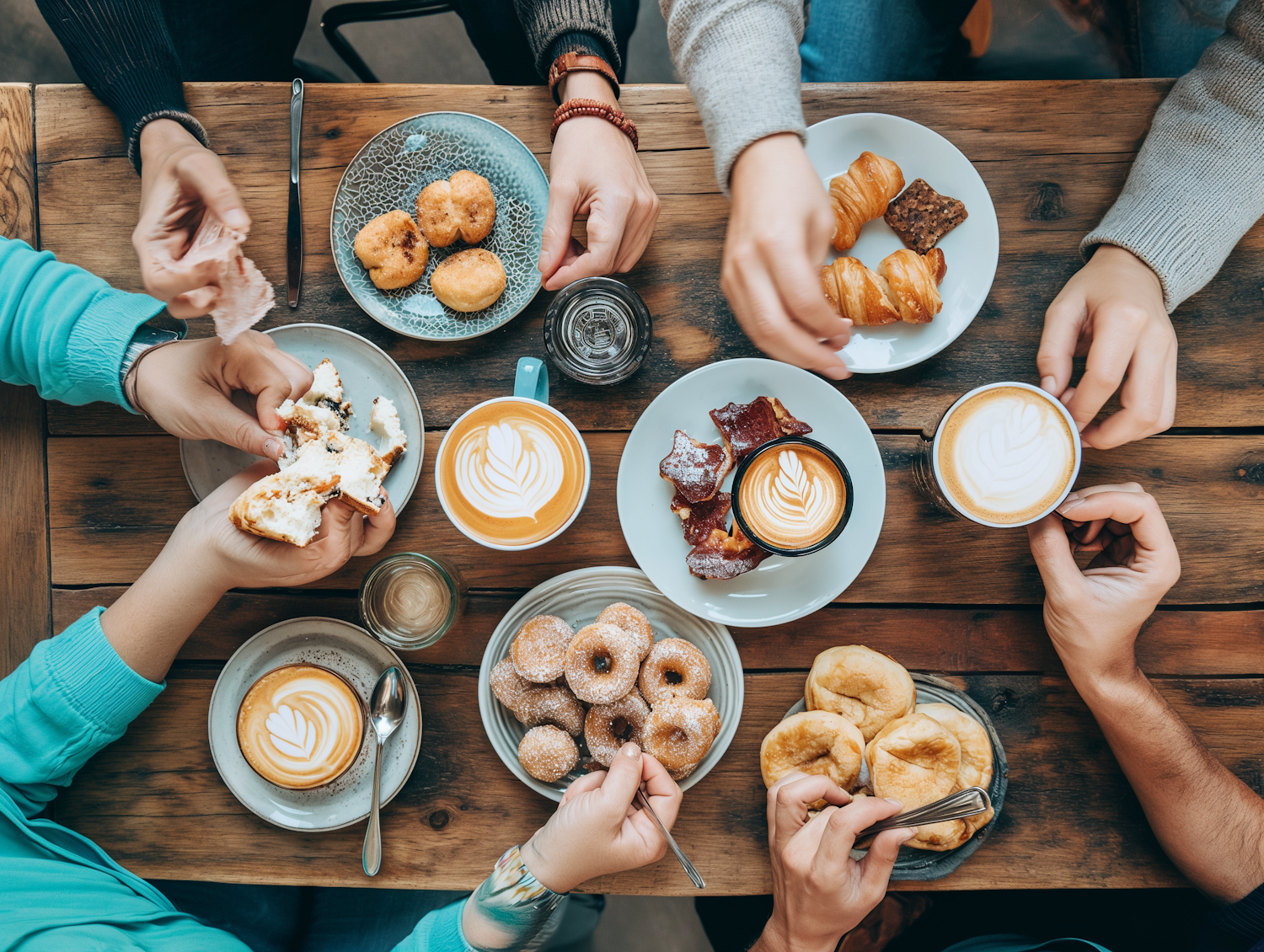 Top-down view of a cozy table with pastries, coffee, and hands reaching in, capturing a warm and social dining moment.