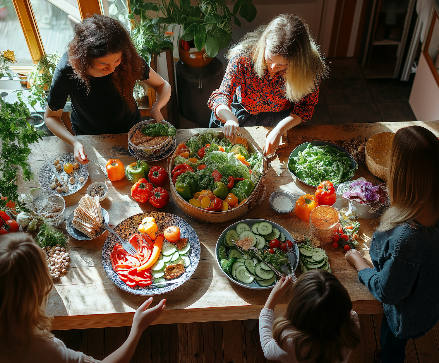 A group of people preparing a colorful vegetable meal together at a sunlit table, surrounded by fresh ingredients and greenery.