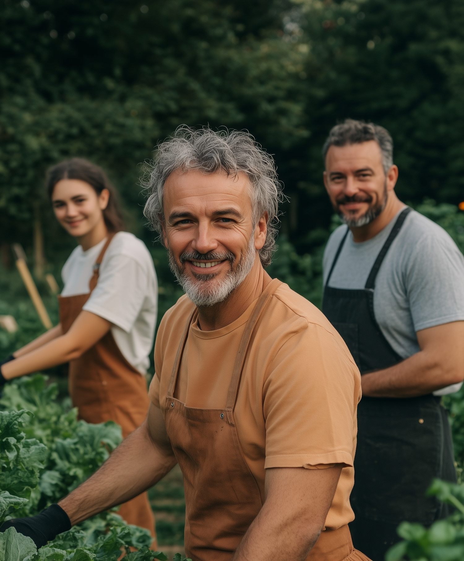 Three people gardening together, smiling in a lush green setting, wearing aprons and casual attire, surrounded by leafy plants.