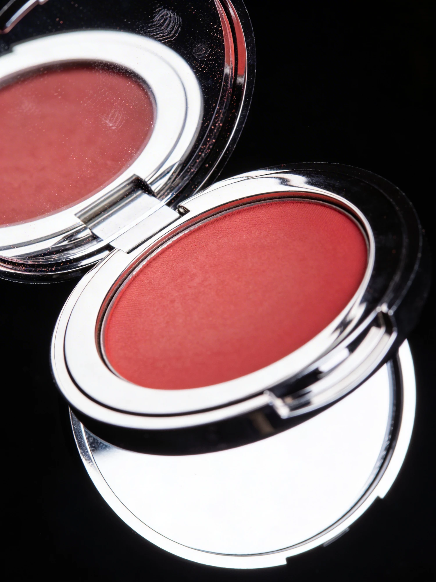A sleek, open silver round compact makeup case featuring a red blush compact with a mirror with a reflective surface flash reflecting harshly with blown highlights cropped too tight on one side fingerprints and dust visible set against a black background for a modern, elegant look. + master prompt