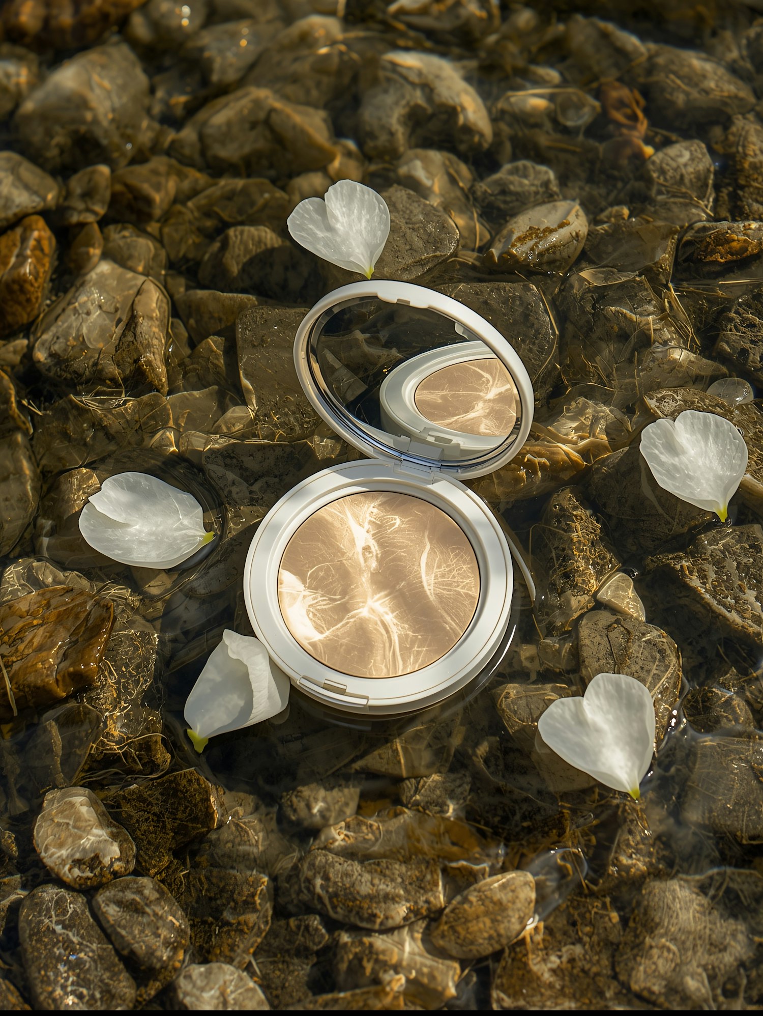 Open compact with shimmering powder on wet stones, surrounded by white petals, reflecting sunlight for a serene, natural aesthetic.