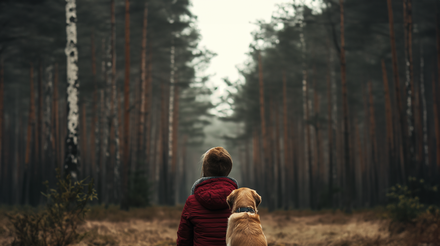 Child in red jacket and dog in misty forest, surrounded by tall trees and soft light, creating a serene and contemplative atmosphere.