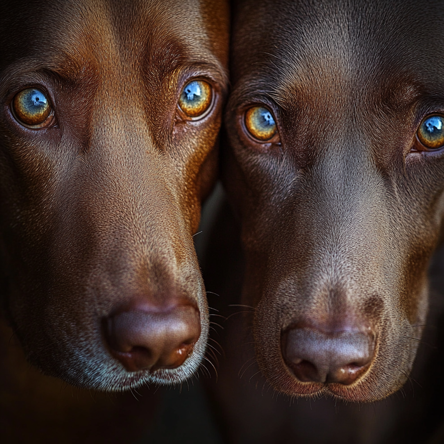 Close-up of two brown dogs with striking blue and amber eyes, showcasing their glossy coats and expressive features.