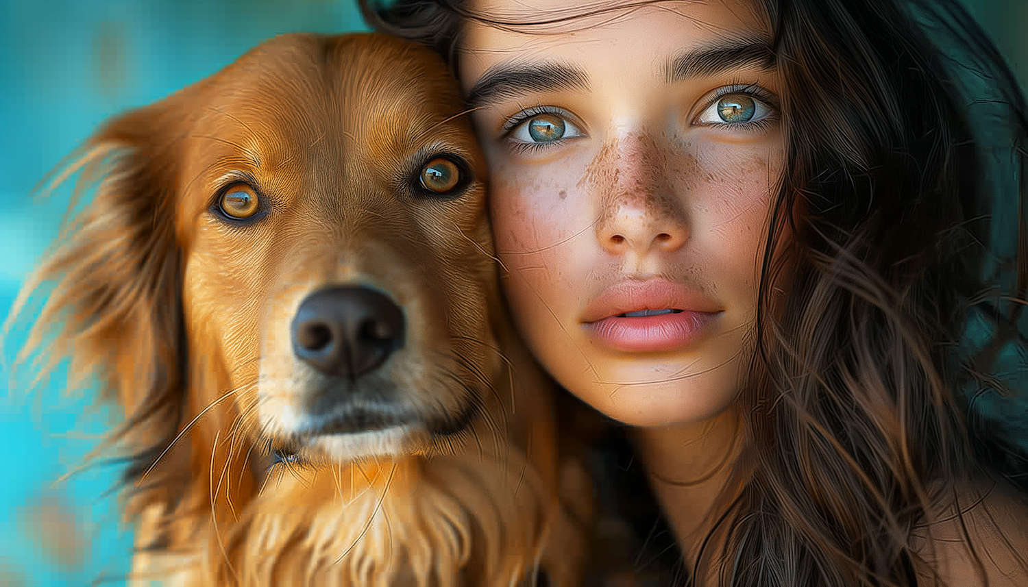 A serene portrait of a young woman with freckles and a golden retriever, both gazing directly at the viewer against a turquoise background.