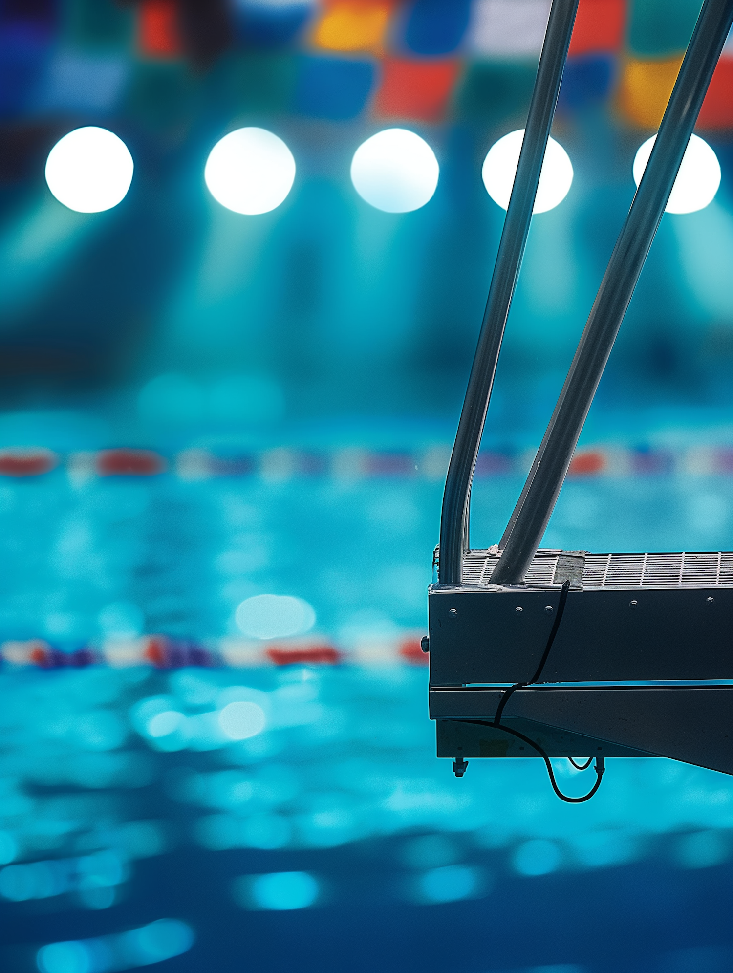 Diving board over a vibrant blue pool with colorful flags and bright lights in the background.