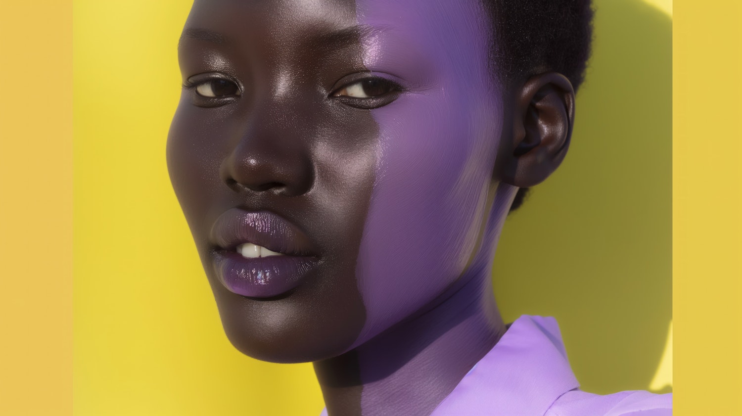 Bold portrait of a woman with purple face paint against a bright yellow background, showcasing striking color contrast and artistic expression.
