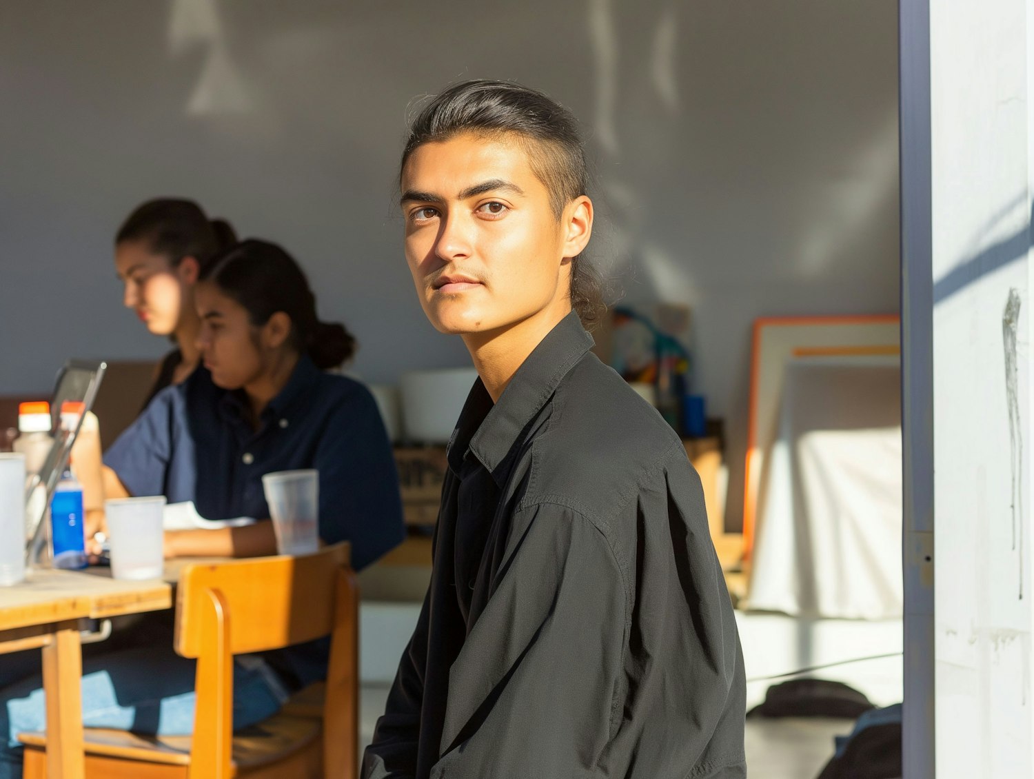 Young man in a sunlit room, wearing a black shirt, with two women working in the background. Creative and warm atmosphere.