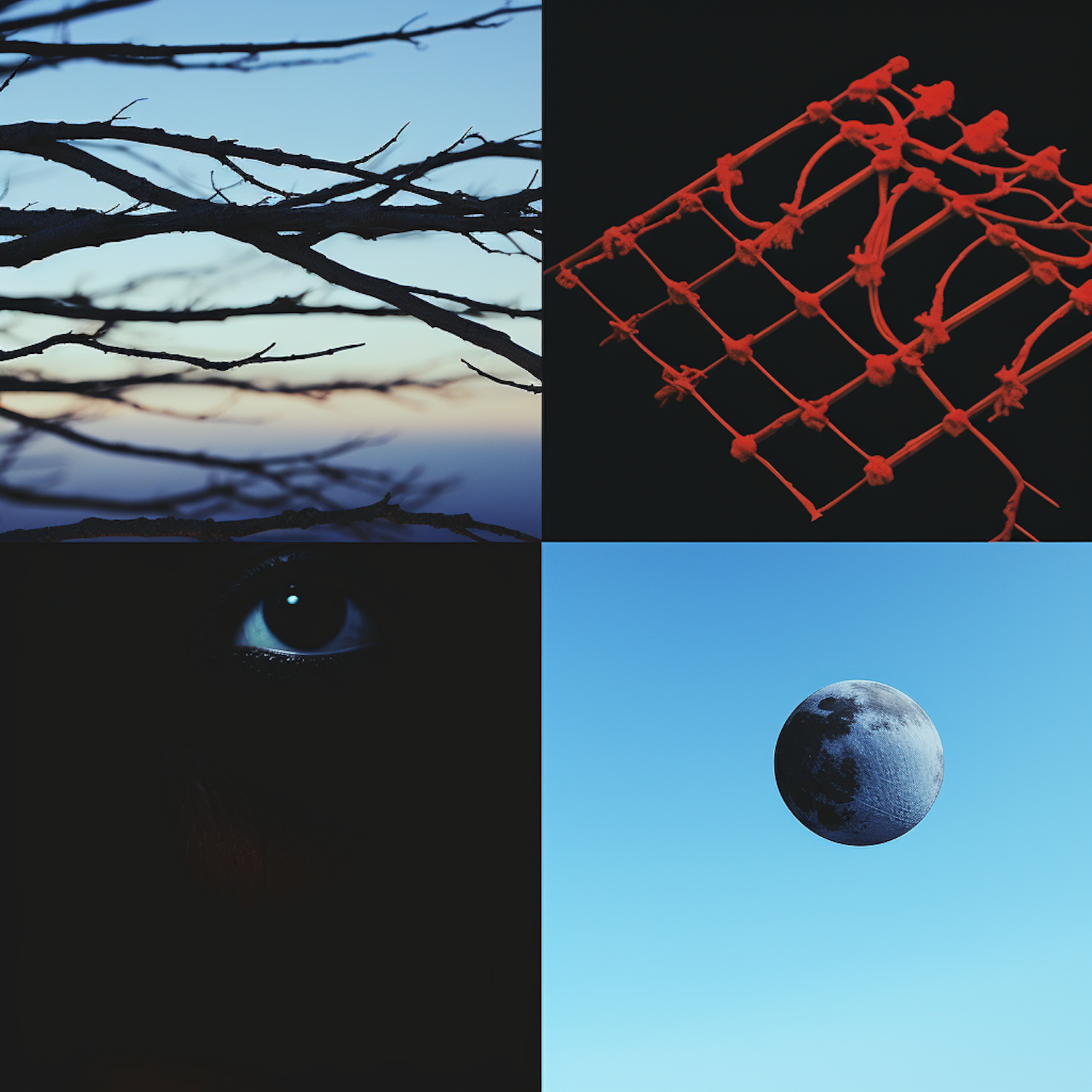 Collage of tree branches, red net, human eye, and moon against varied backgrounds.
