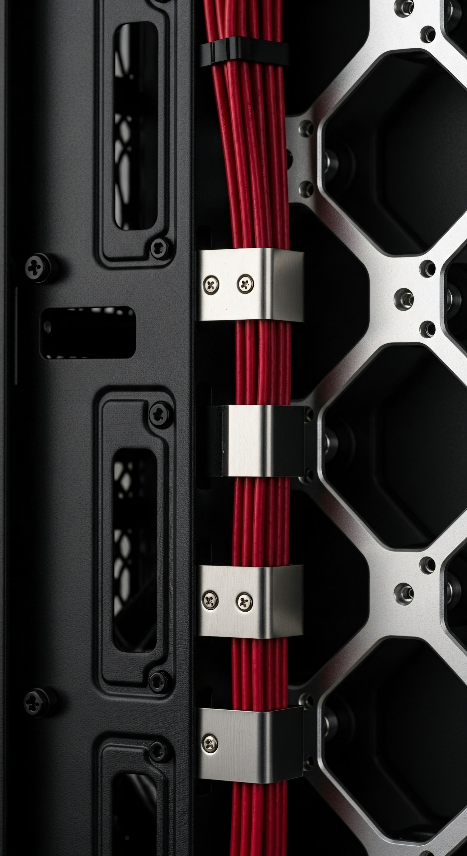Close-up of red cables neatly secured with metallic clamps inside a sleek computer case, showcasing professional cable management.