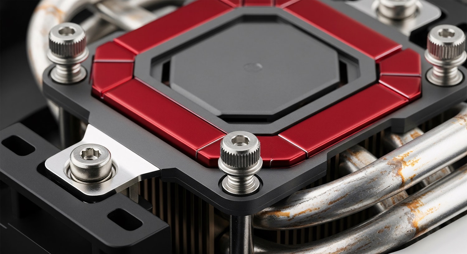 Close-up of a computer cooling system with a red and black mounting bracket, metallic heat pipes, and detailed screws.