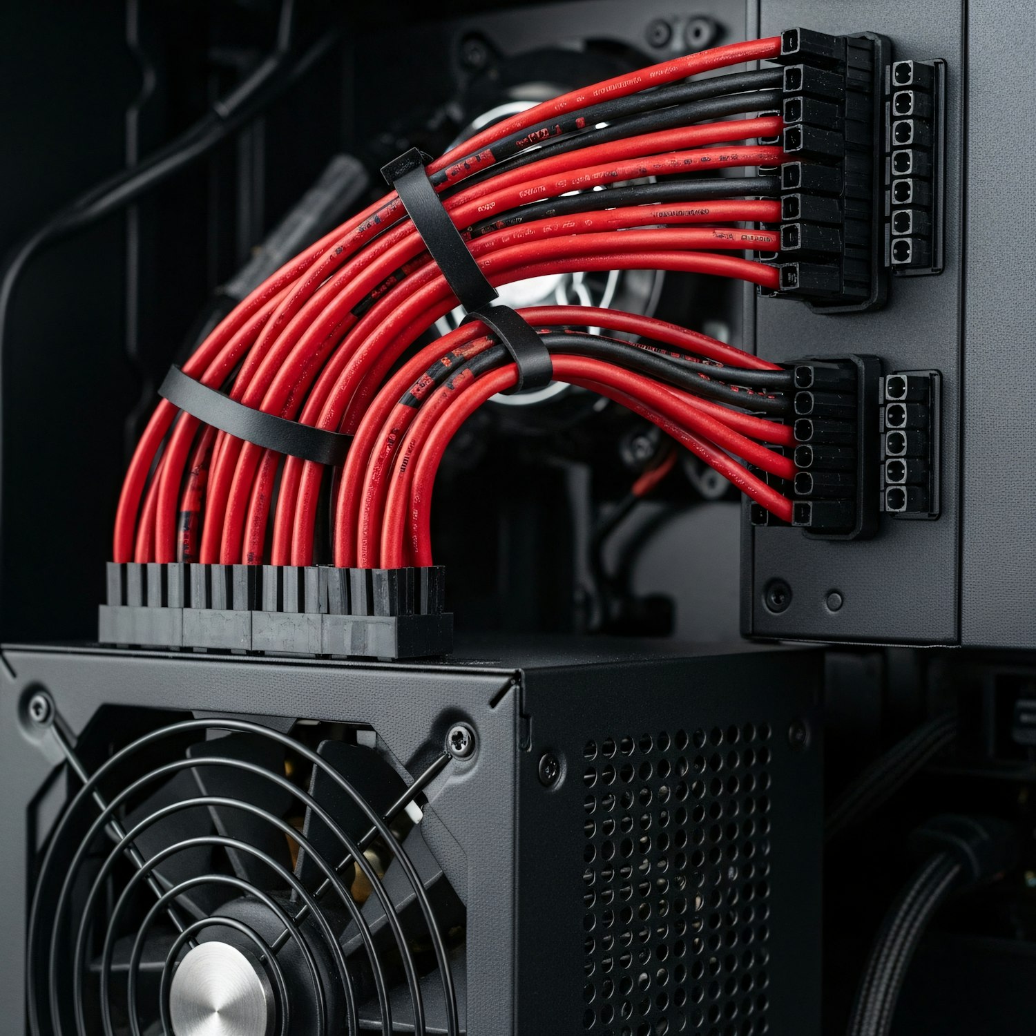 Close-up of a computer PSU with neatly managed red and black sleeved cables, showcasing clean cable organization and hardware setup.