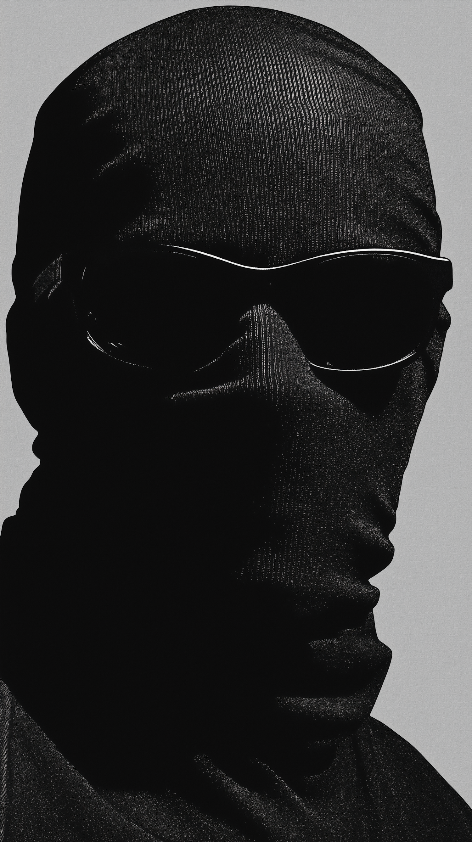 Mysterious figure in black fabric and sunglasses, creating an enigmatic silhouette against a light gray background.