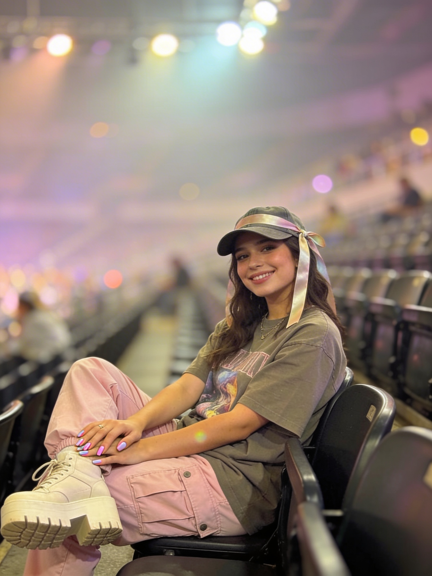 A high‑definition, Pinterest‑viral arena moment with a soft‑edge streetwear aesthetic. A person sits in the stands wearing an oversized graphic tee, pastel cargo pants, platform sneakers, and a ribboned cap. Their nails are pastel‑painted, and their expression is candid and warm. The arena lights create soft highlights, giving the scene a dreamy, editorial feel. No logos, no watermarks.