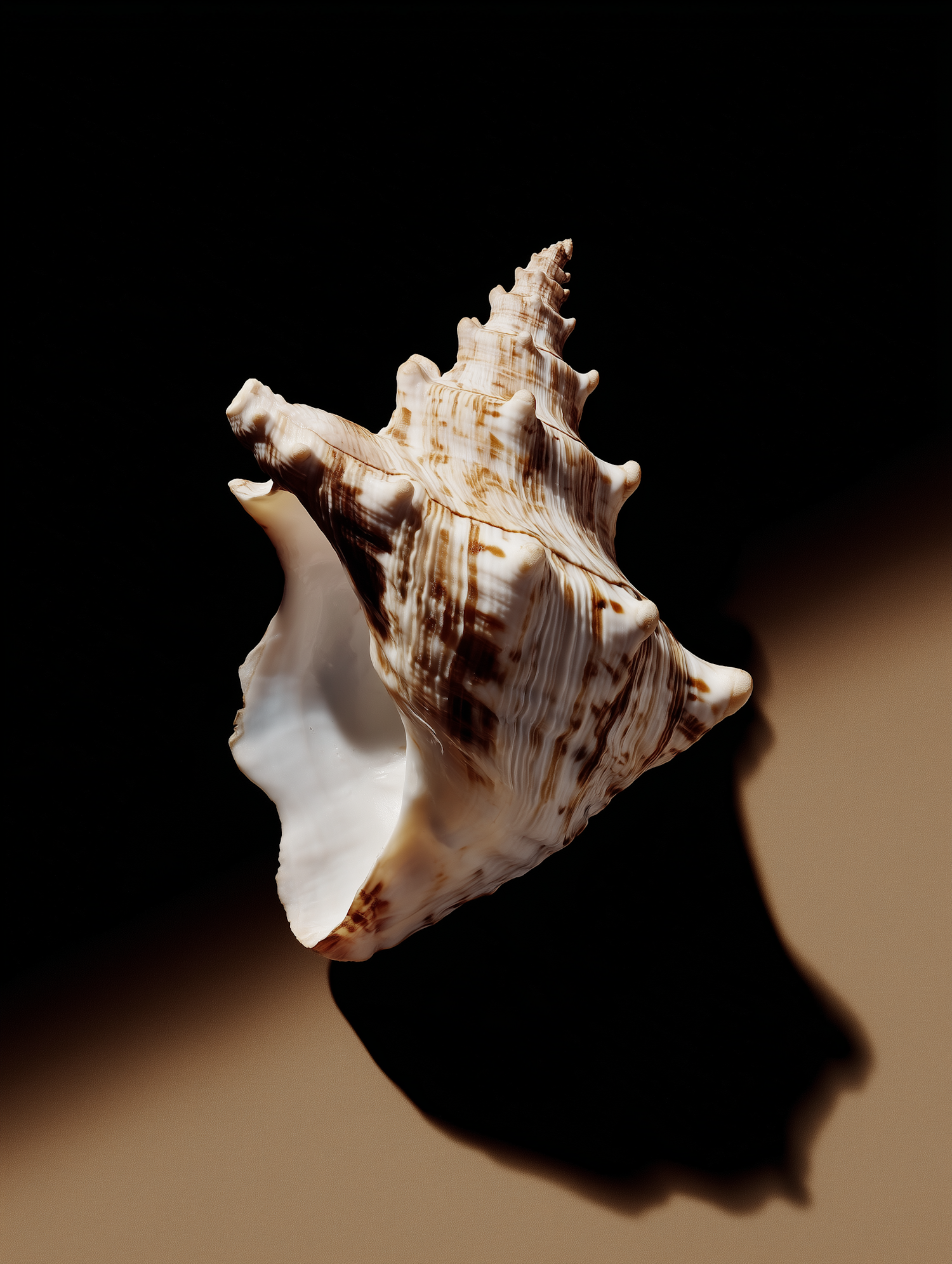 A detailed close-up of a conch shell with intricate textures and patterns, set against a dark background with dramatic lighting.