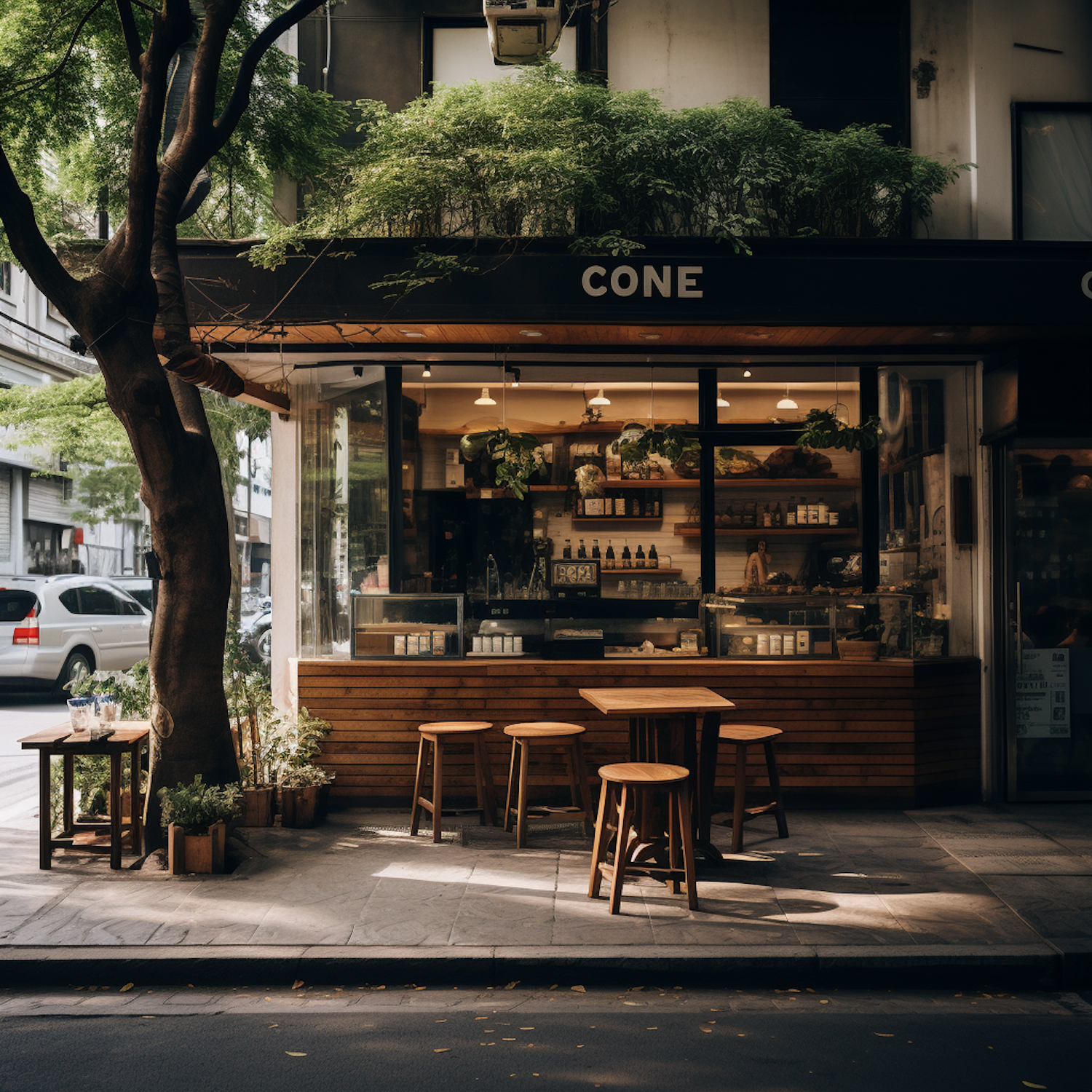 Charming street-side café 'CONE' with outdoor seating, lush greenery, and rustic interior. Perfect for a cozy coffee break.