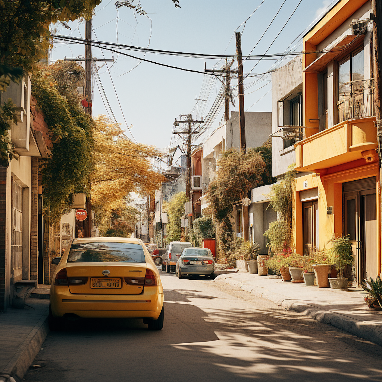 Charming urban street with colorful buildings, lush greenery, and parked cars under warm sunlight.