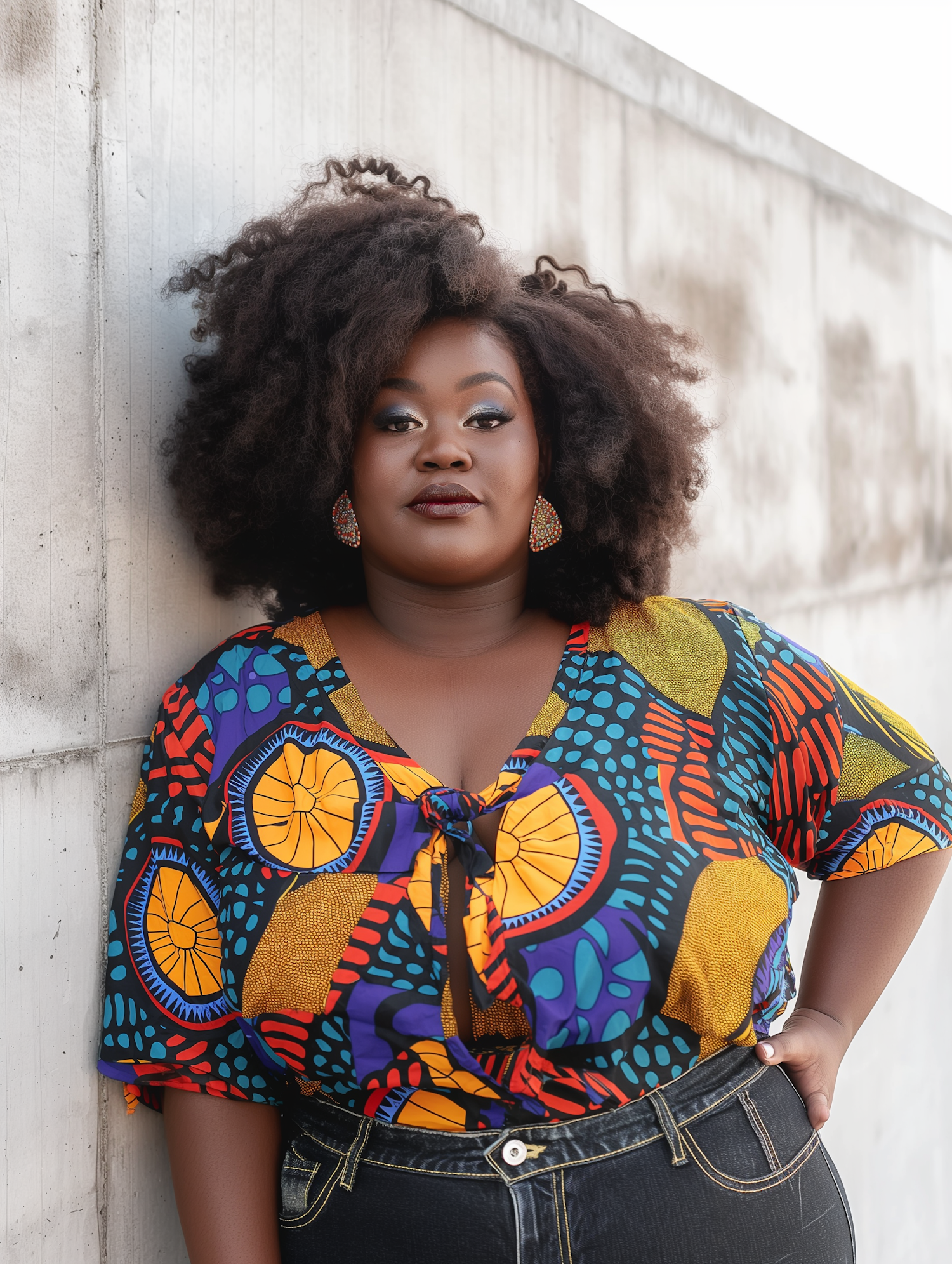 Confident woman in vibrant patterned blouse against a concrete wall, showcasing bold fashion and natural hair.