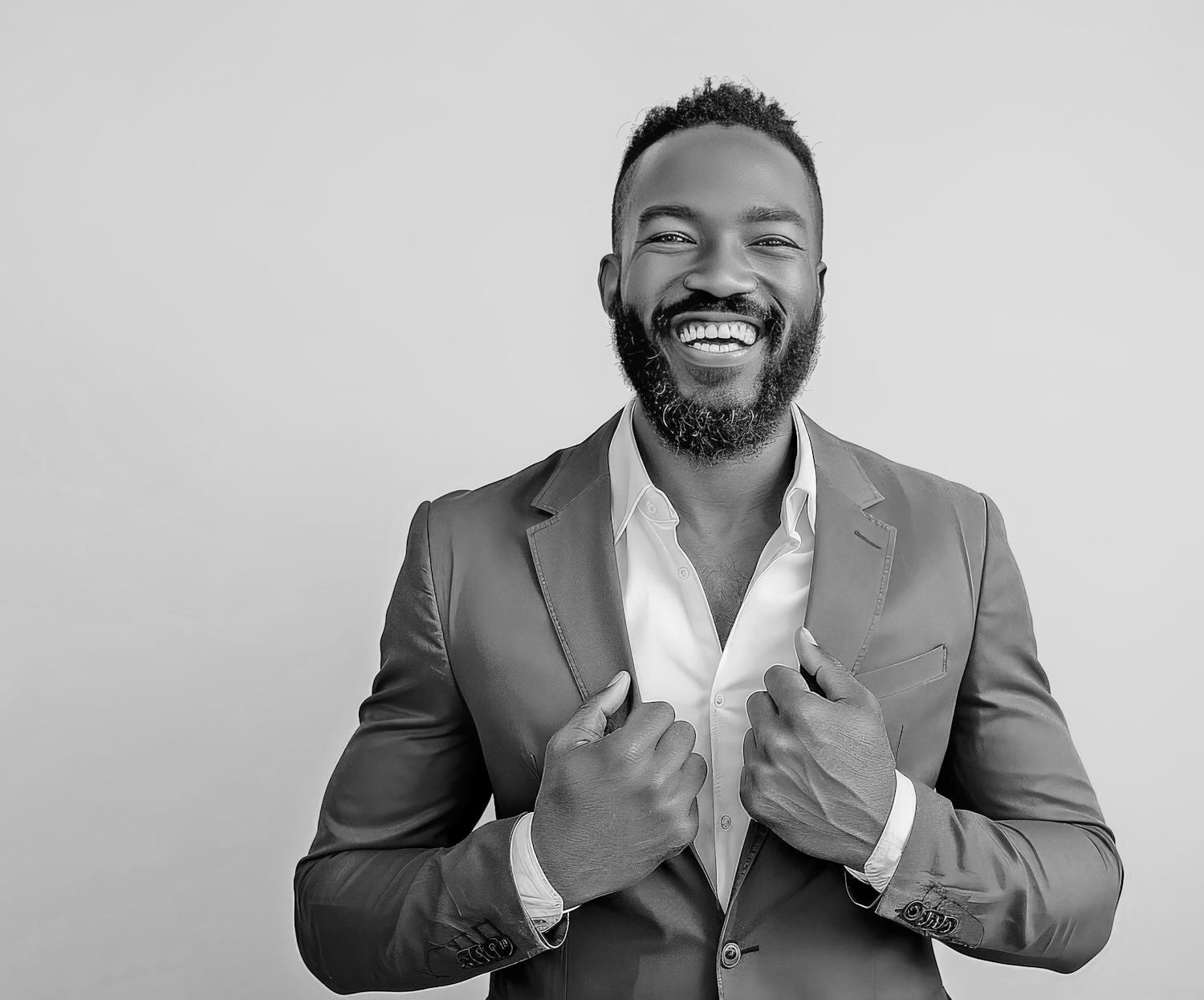 Confident man in a suit smiling broadly, exuding warmth and professionalism in a classic black and white portrait.