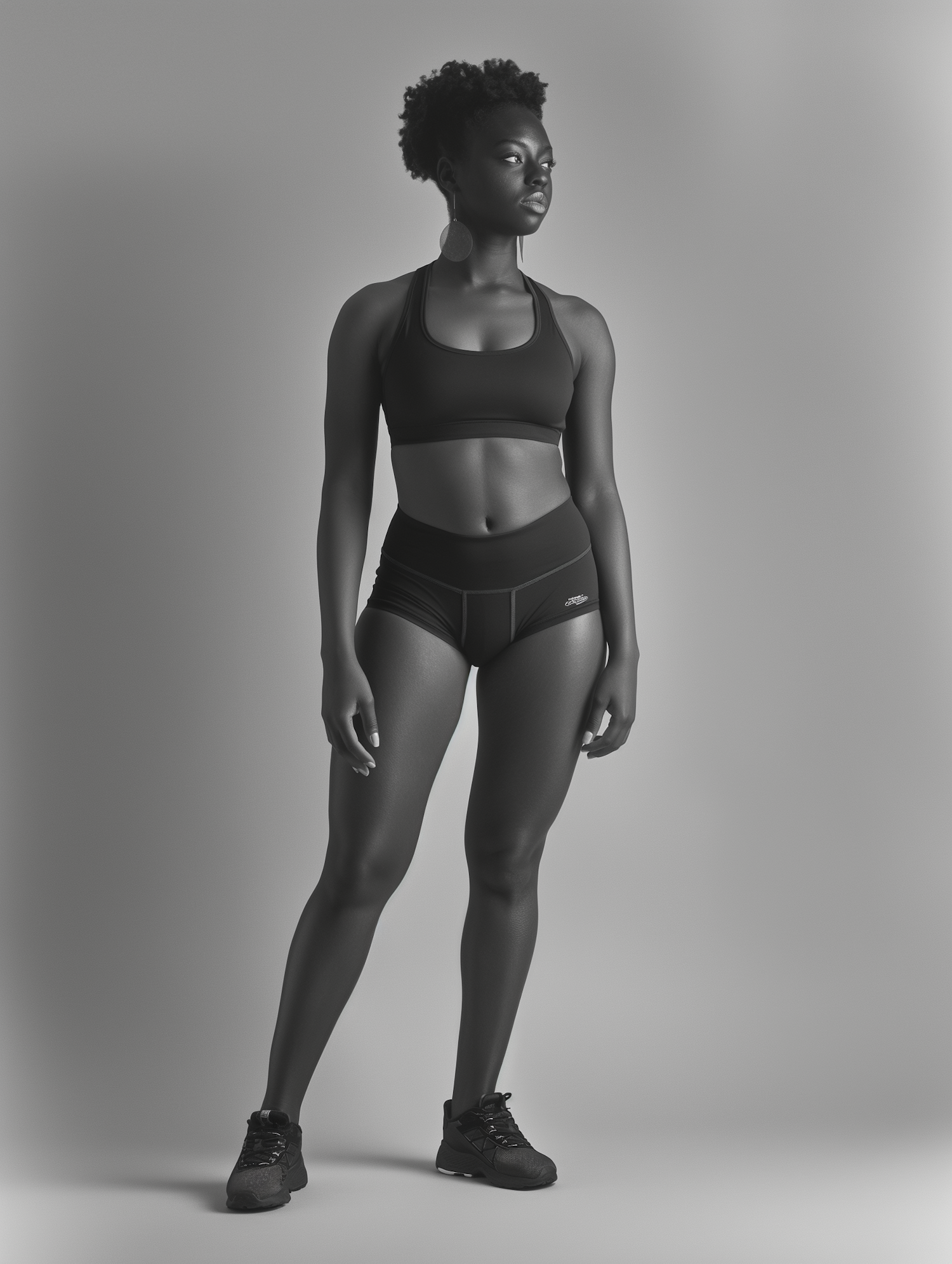 Confident Black woman in athletic wear, showcasing strength and style with a natural afro and hoop earrings.
