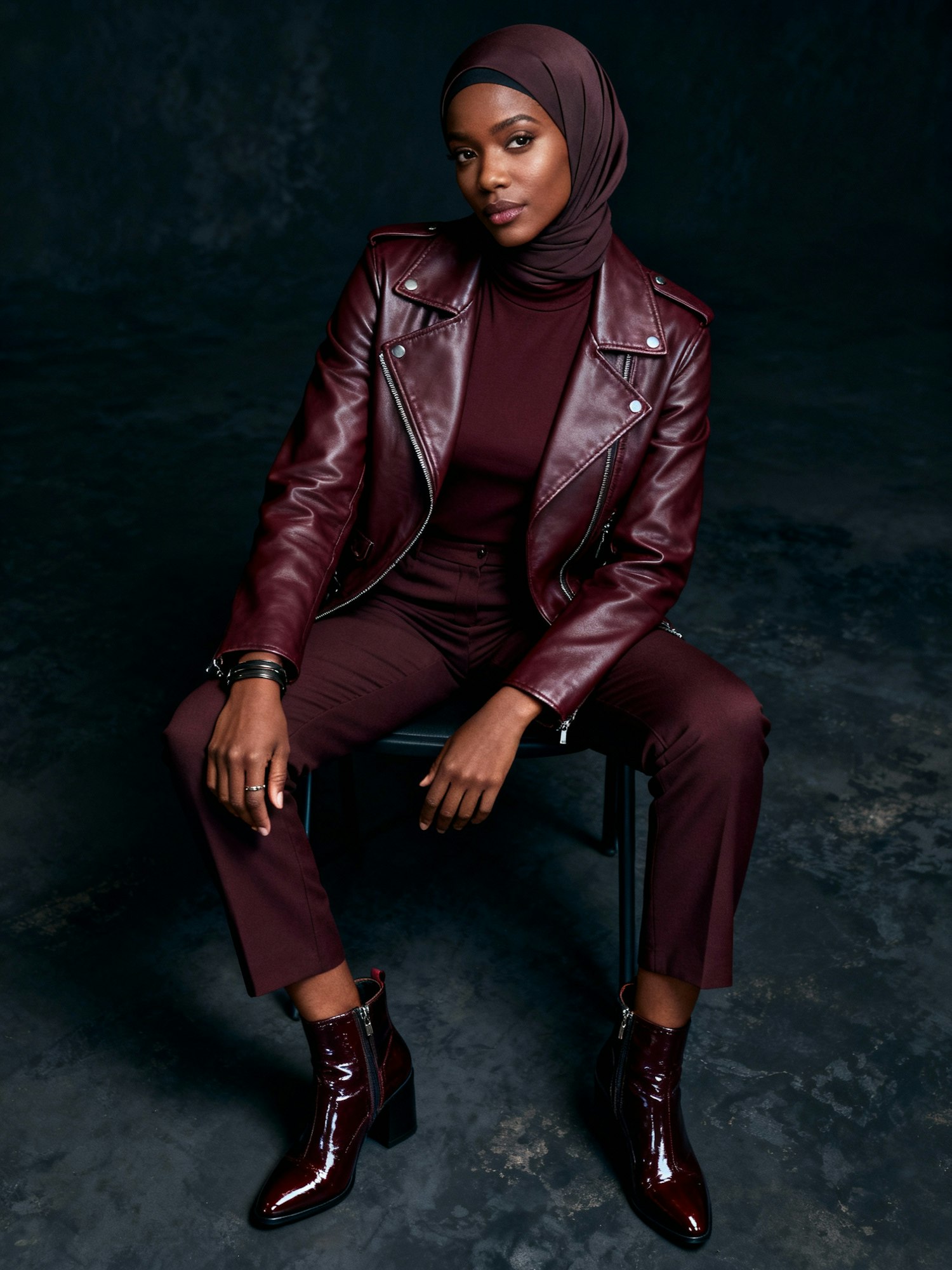 High-definition, cinematic portrait of a stylish Black woman wearing a rich burgundy leather jacket over a high-neck top and tailored trousers, fully covering her body. She wears a sleek, stylish hijab scarf that completely covers her hair and frames her face elegantly, paired with subtle edgy accessories and cute, polished ankle boots. Seated confidently against a deep, textured dark background, she exudes modern biker-lady poise and elegance. Soft, directional lighting highlights the textures of her outfit, the shine of her boots, and her glowing skin. Her posture is relaxed yet commanding, with a subtle, confident expression. Fashion-forward, modest, and visually striking—perfect for an editorial or street-style portrait.