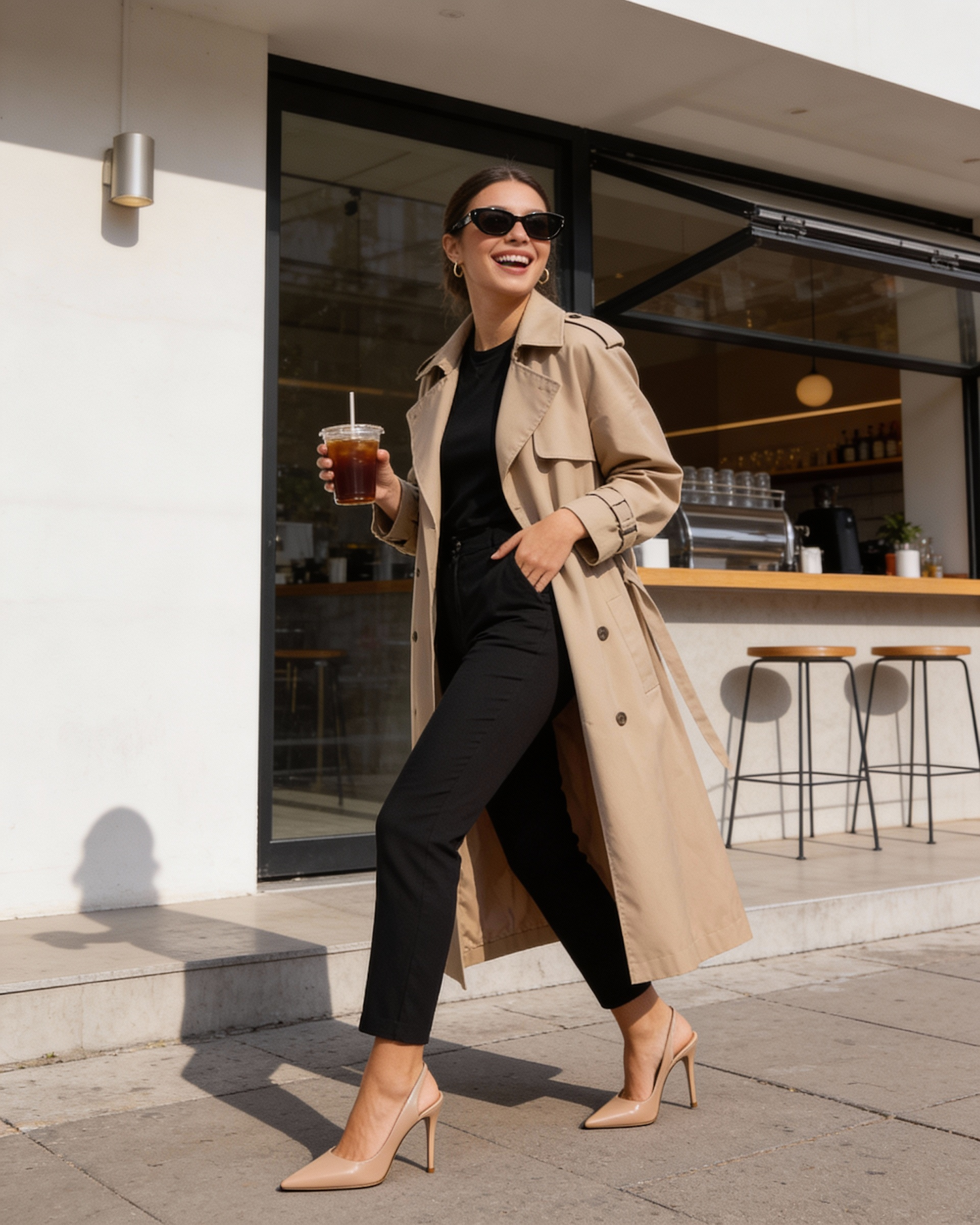 Stylish woman in a beige trench coat and black outfit walking with iced coffee outside a modern cafe, exuding confidence and elegance.