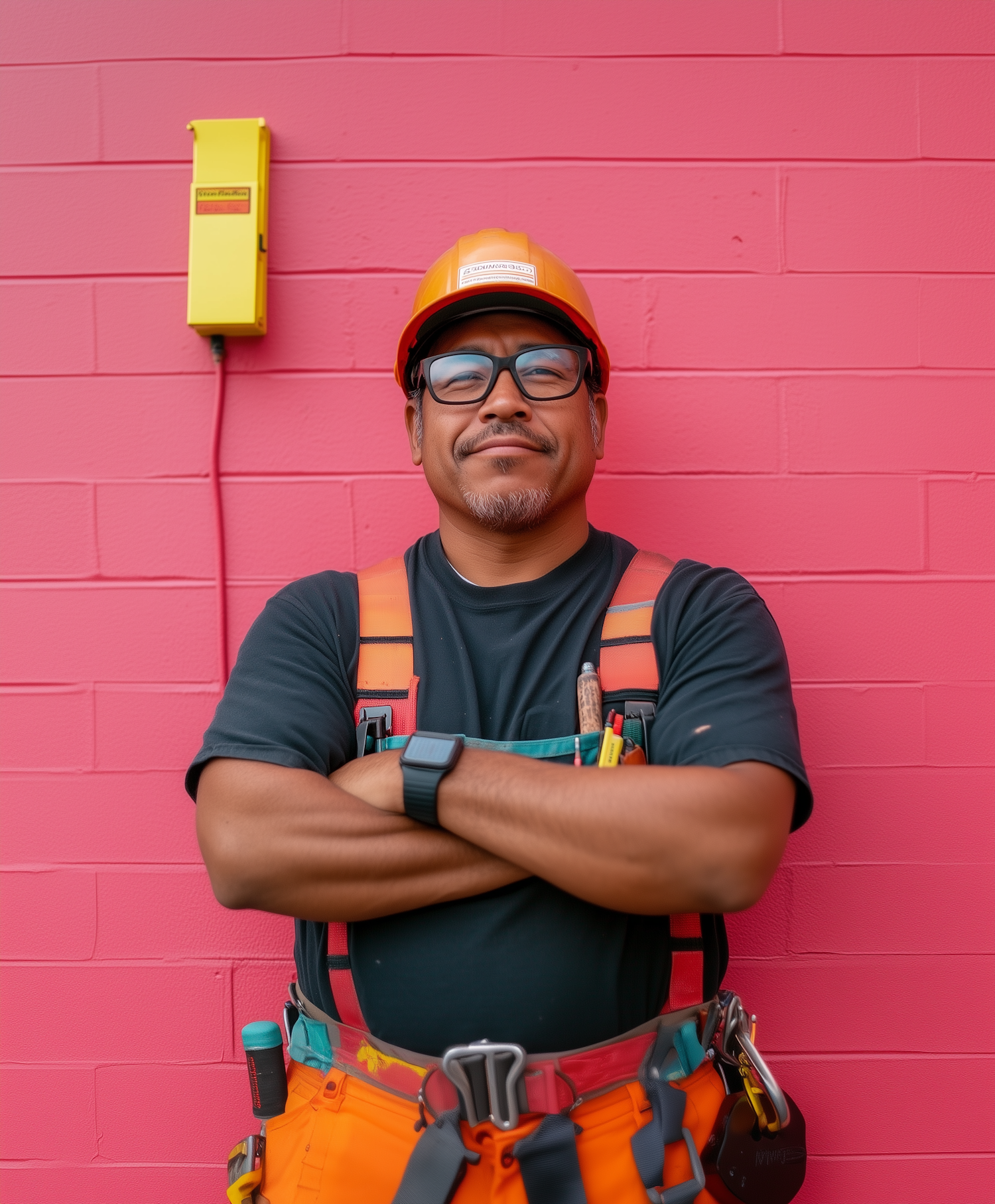Confident construction worker in orange gear stands against a vibrant pink wall, exuding professionalism and pride.