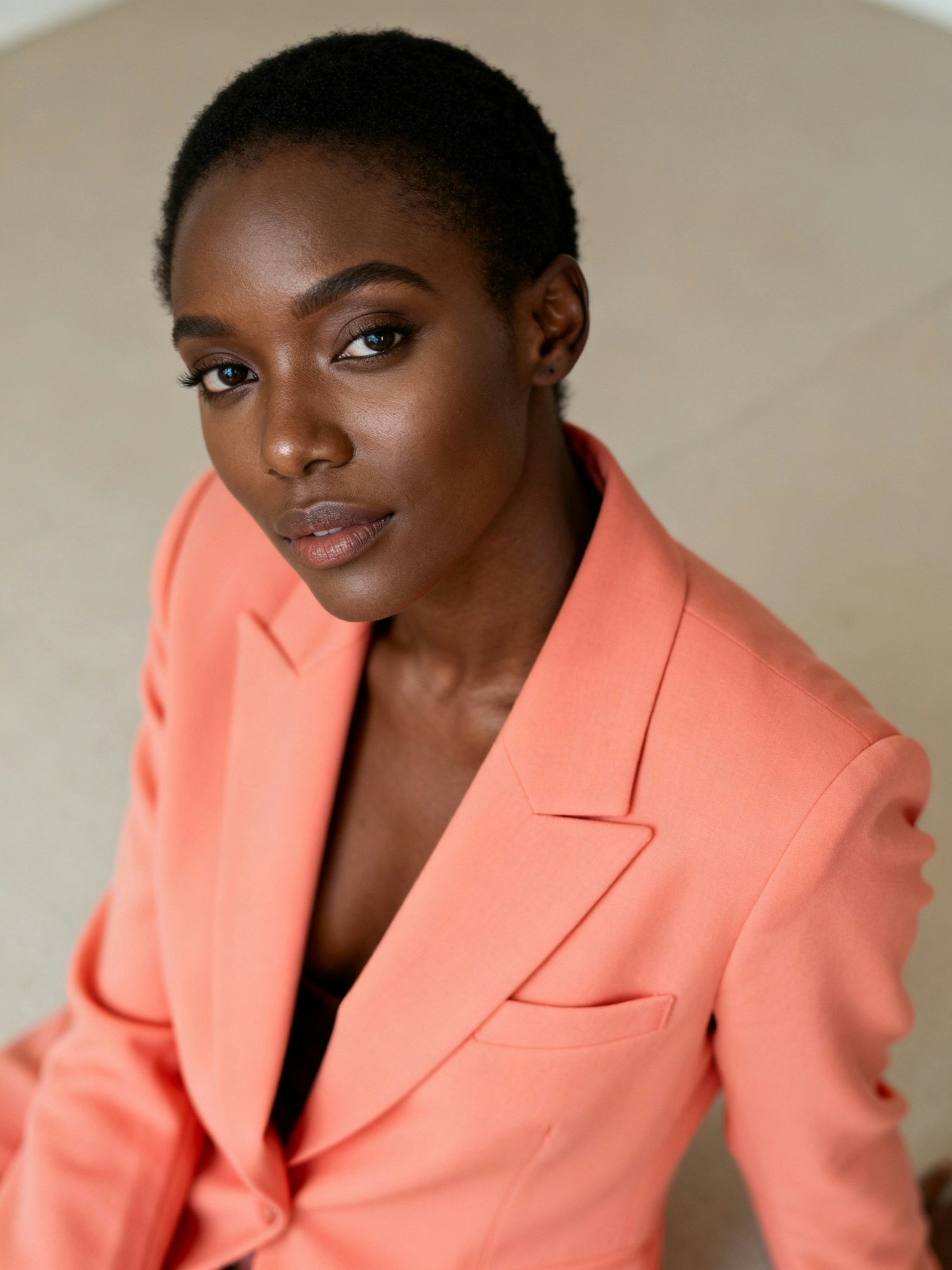 High-definition portrait of a stylish Black woman wearing a soft coral blazer that complements her glowing skin. She poses with calm confidence against a neutral, minimalist backdrop, allowing the warm coral tones to stand out. Soft, even lighting highlights her natural beauty, refined features, and the smooth texture of the blazer. The mood is elegant, modern, and effortlessly sophisticated—perfect for a fashion editorial or beauty-focused portrait.
