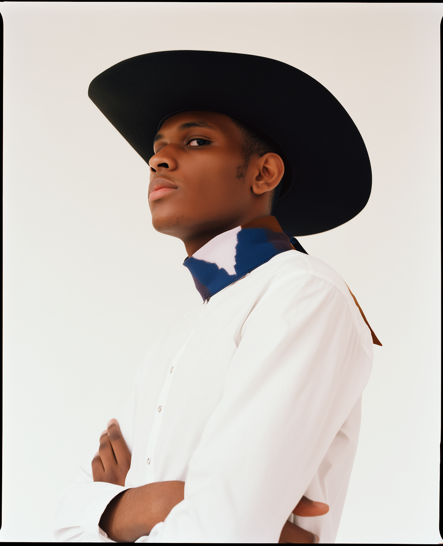 A stylish portrait of a man in a cowboy hat and patterned scarf, exuding confidence against a clean white background.