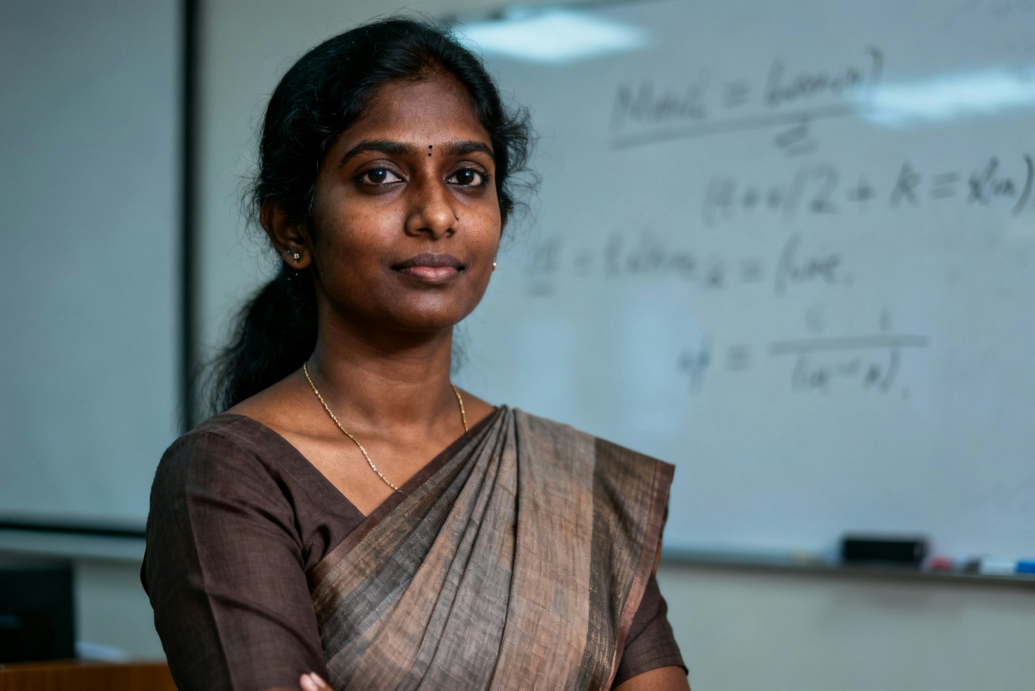 Environmental portrait of a South Asian woman ML researcher in a tasteful sari with minimal jewelry; deep brown skin, cool undertone; whiteboard equations softly out of focus behind; softbox key, subtle hair light; 85mm, f/2.0; editorial, RAW, high micro-contrast, thoughtful and confident