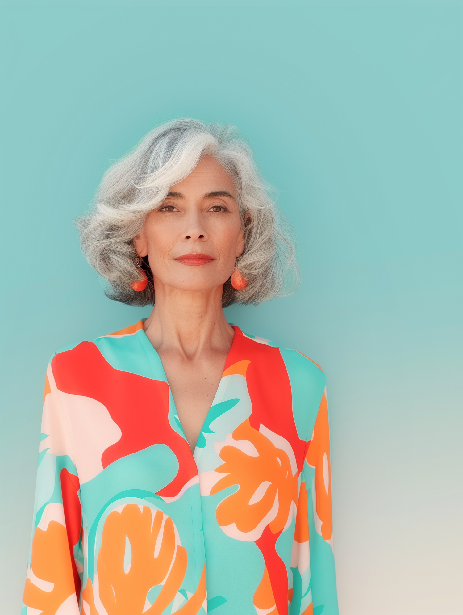 Elegant mature woman with silver hair in vibrant patterned blouse against turquoise background, exuding confidence and style.