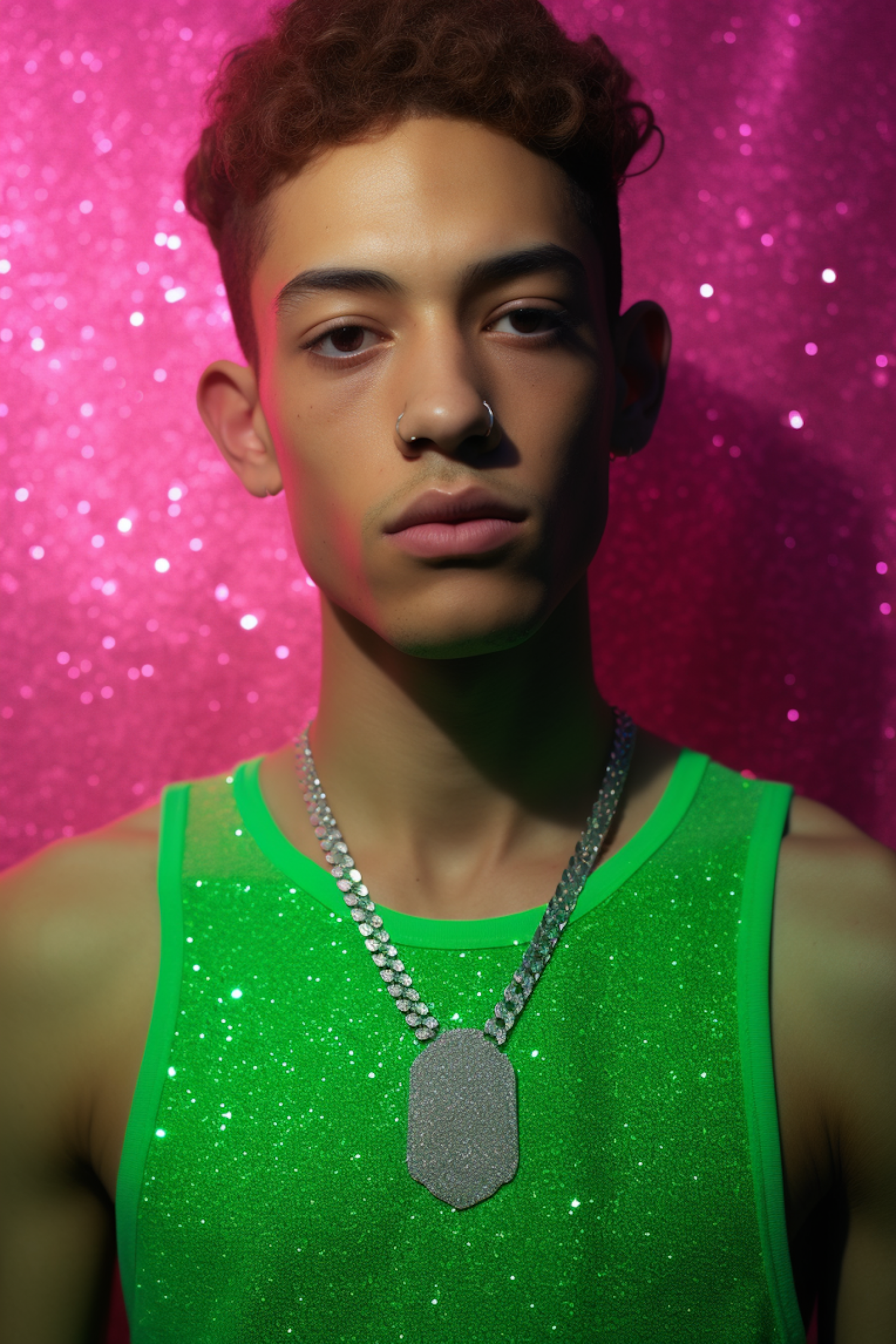 Young man in a glittery green tank top with a silver chain, set against a pink glittery background.