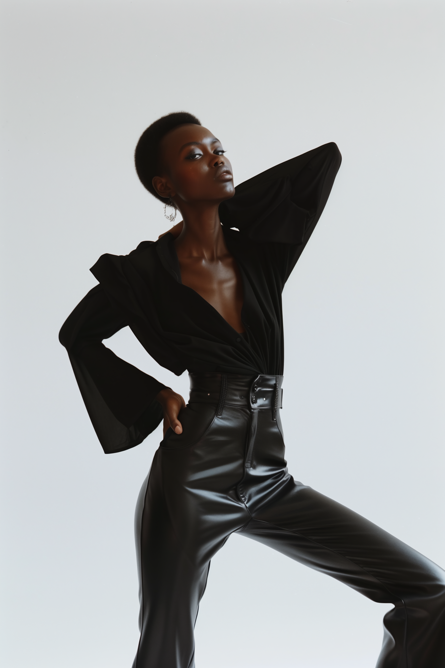 Stylish woman in black leather pants and flared-sleeve top striking a bold pose against a minimal background.