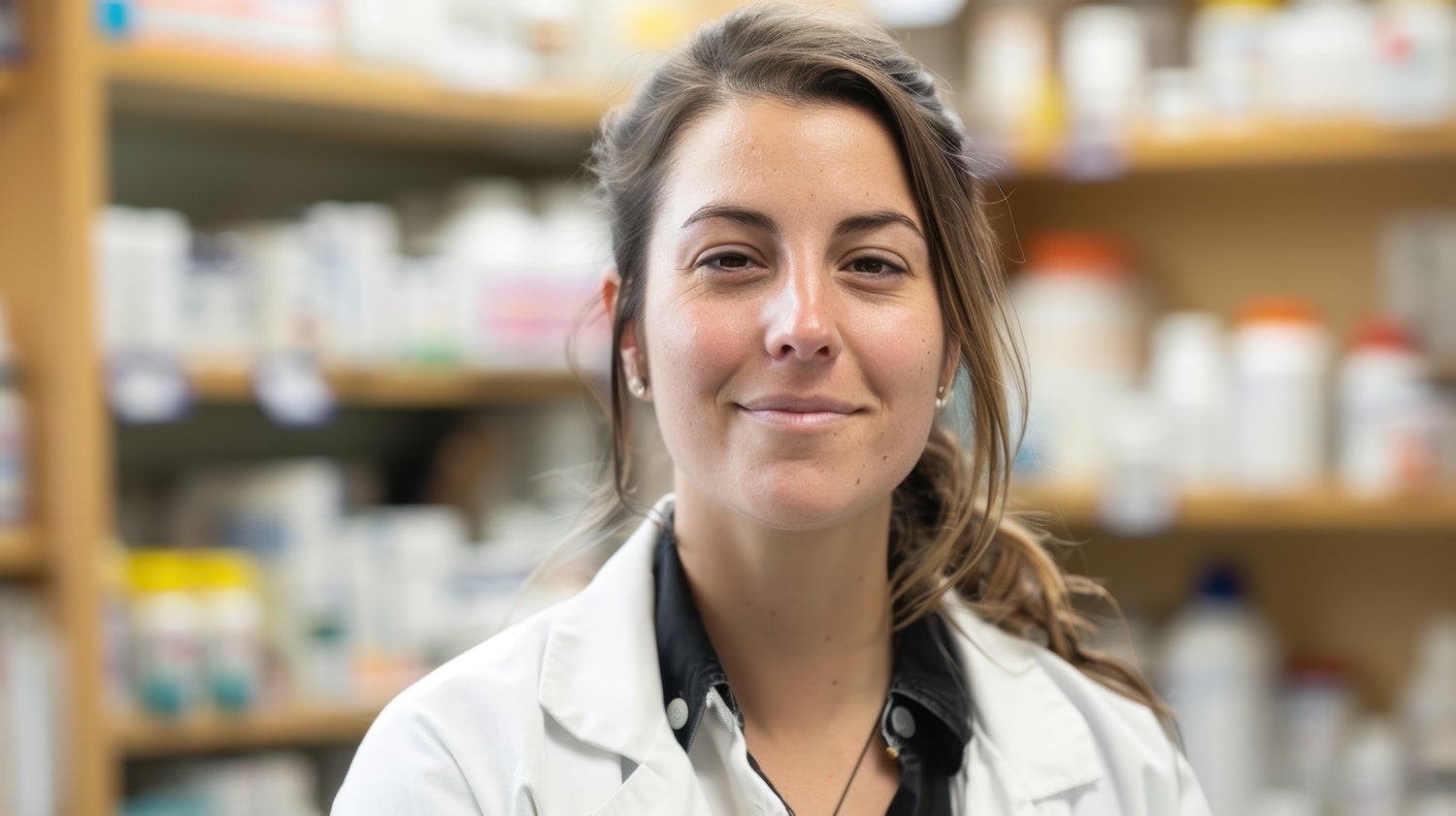 Confident young female scientist in a lab coat, standing in a laboratory with shelves of bottles in the background.