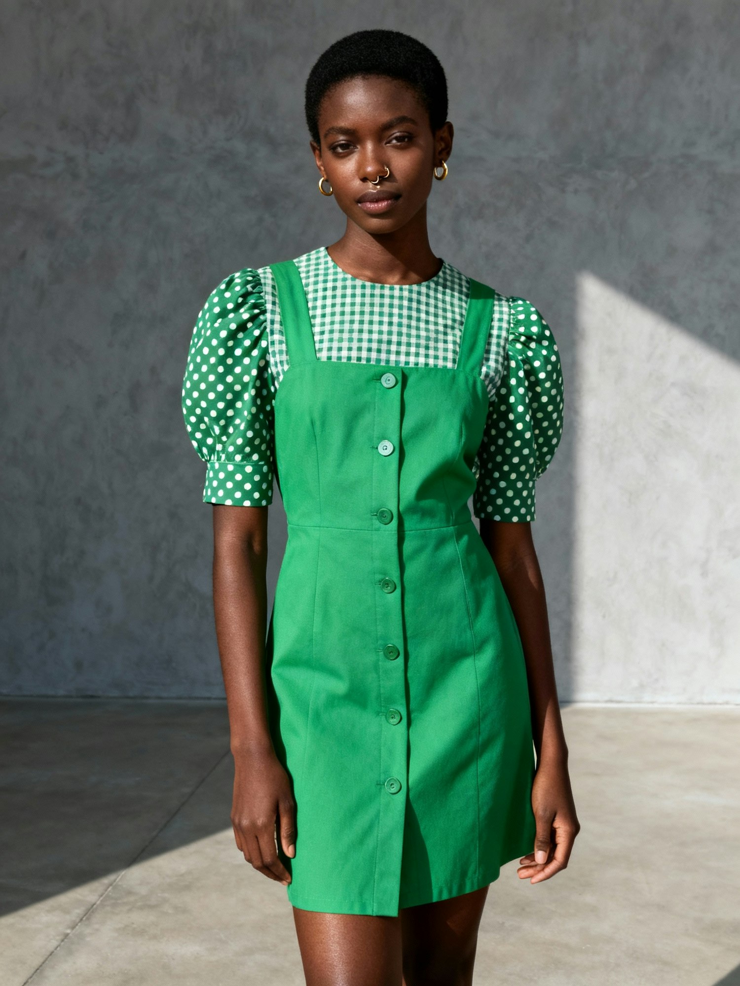 Waist-up, high-definition portrait of a young Black woman standing against textured gray walls and a smooth concrete floor. She wears a green pinafore-style dress with polka-dotted sleeves. The fabric blends checkered and dotted patterns, with buttons running down the front. Her short black hair is styled simply, and she gazes confidently at the camera. Her melanin glows under soft, directional lighting. She wears small gold hoop earrings and a tiny nose ring, adding subtle shine and personality. The neutral gray background and concrete floor provide a complementary contrast, allowing the vibrant green of her outfit to stand out with clarity and impact. The overall mood is confident, editorial, and culturally expressive—ideal for a fashion portrait or Gen Z identity showcase.