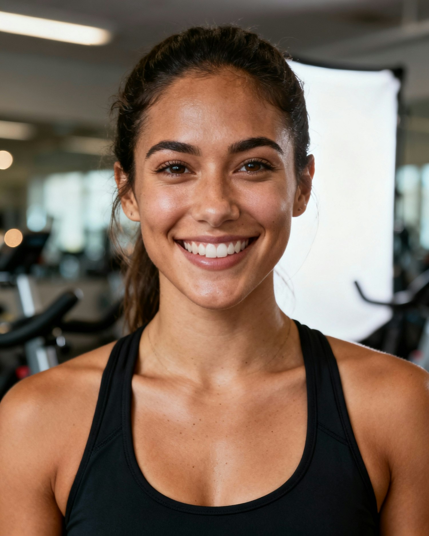 Studio headshot of a woman spin instructor, age 27; medium-tan skin (neutral-warm). Defocused gym interior (soft bokeh); clamshell soft key + gentle rim; crisp white studio light; 105 mm macro-sharp detail. Framing: tight head-and-shoulders, eyes to camera. Wardrobe: non-branded black racerback top. Expression: radiant, energetic smile. Skin: smooth, healthy glow, lightly smoothed. Negative: over-retouch, logos, watermarks, sweat stains, props, banding.
