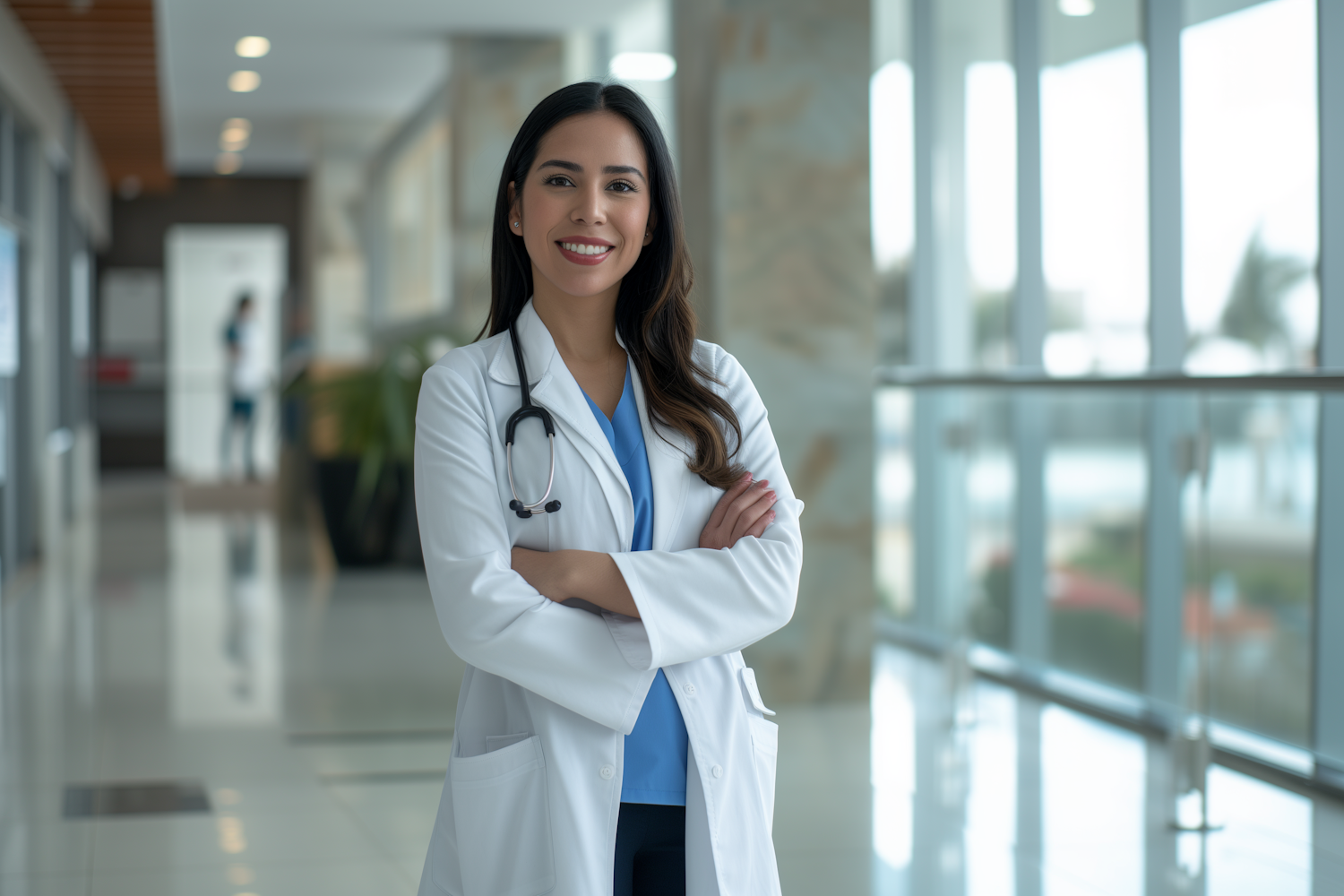 Confident female doctor in a white coat with a stethoscope, standing in a modern hospital corridor with a warm smile.