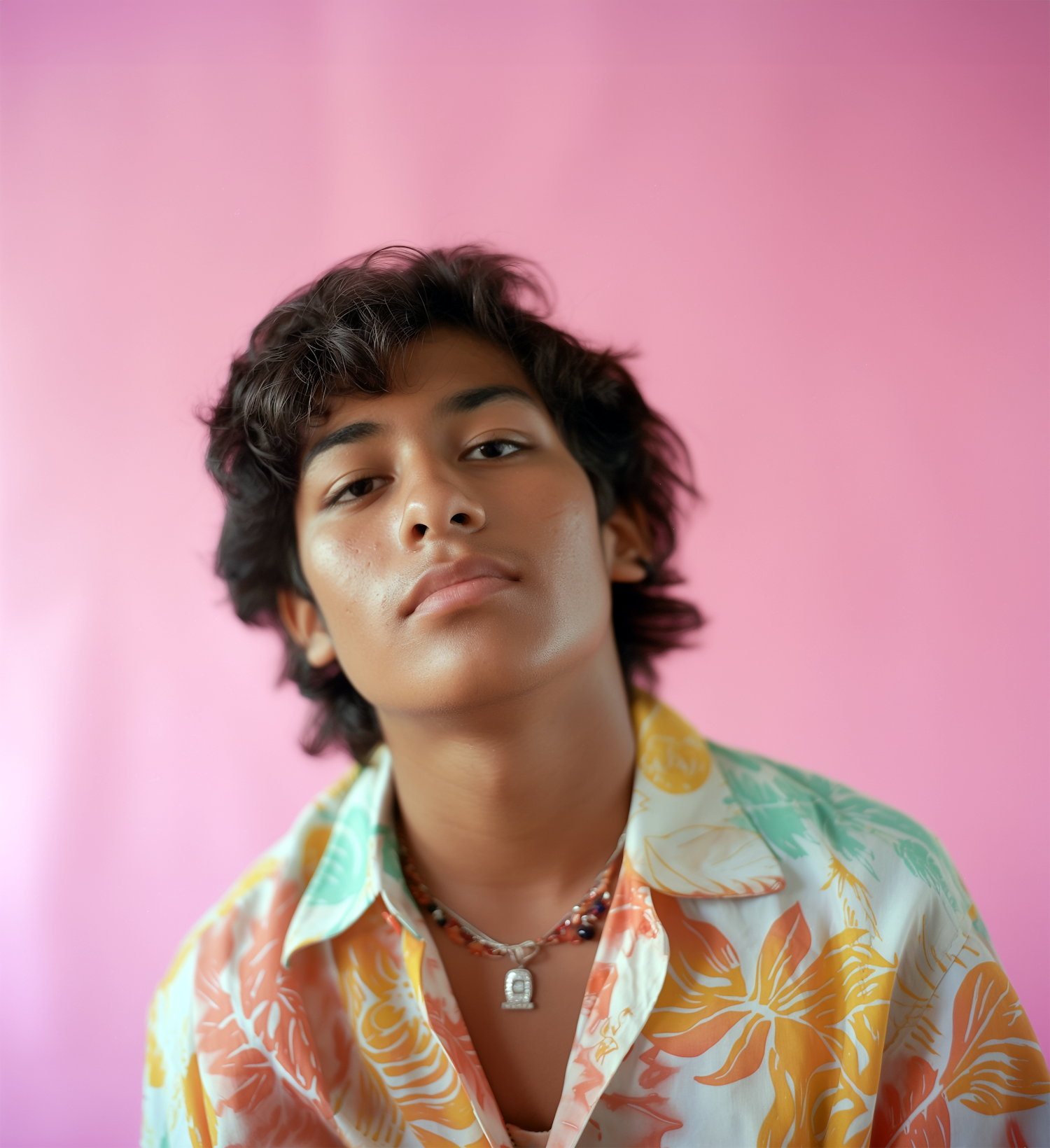 Confident young person in a vibrant floral shirt against a pink background, showcasing bold style and personality.
