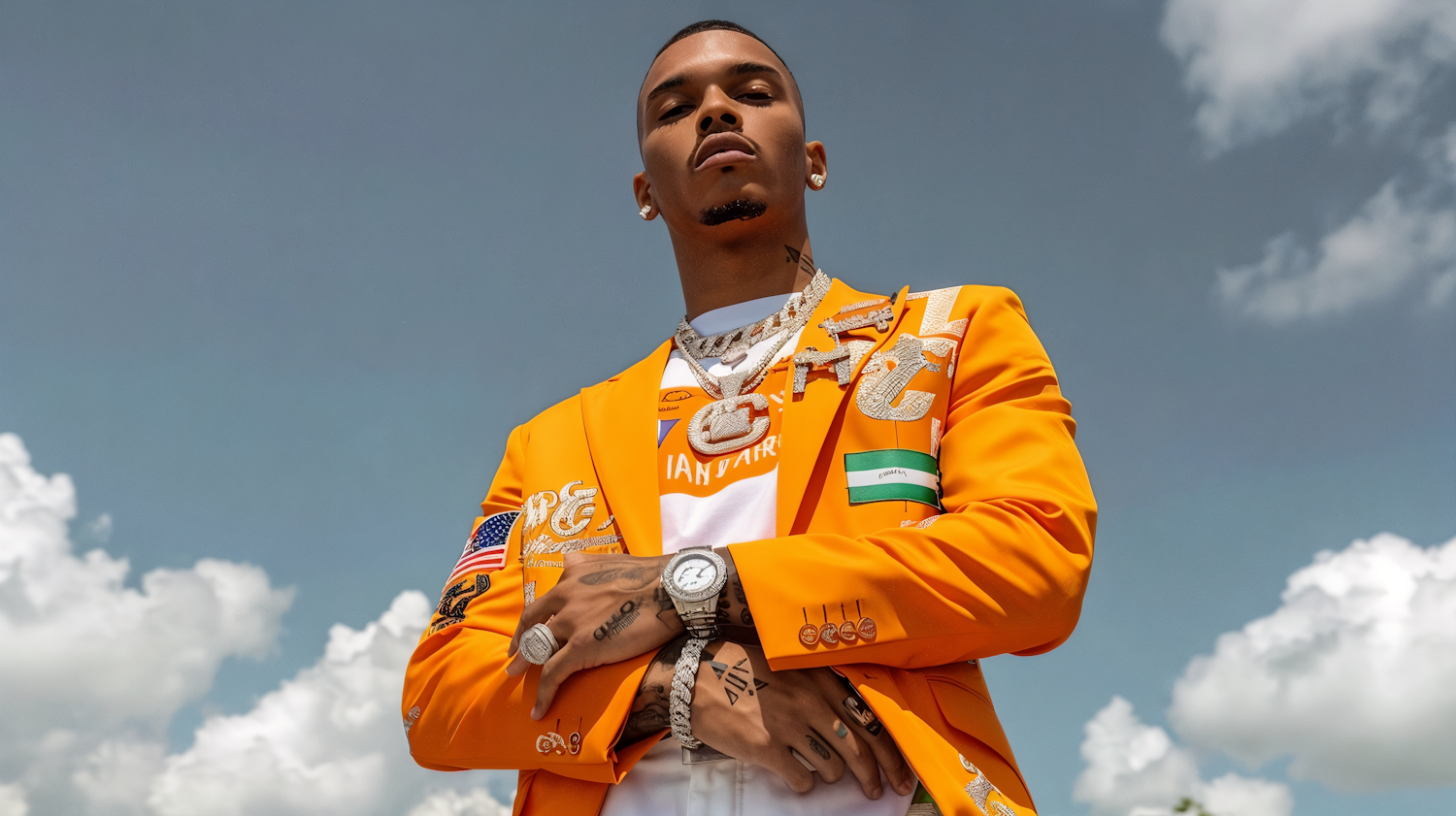 Confident man in vibrant orange jacket with patches, accessorized with jewelry, stands against a clear blue sky with clouds.